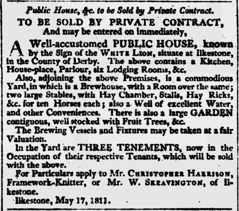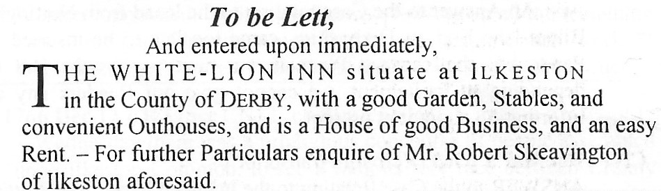 On September 6th, 1821, in the Nottingham Journal, the White Lion Inn was advertised for sale, with an adjoining tenement, all premises occupied by James Wilson. And “the White Lion Inn was kept by Mr. Wilson” recalls Adeline.