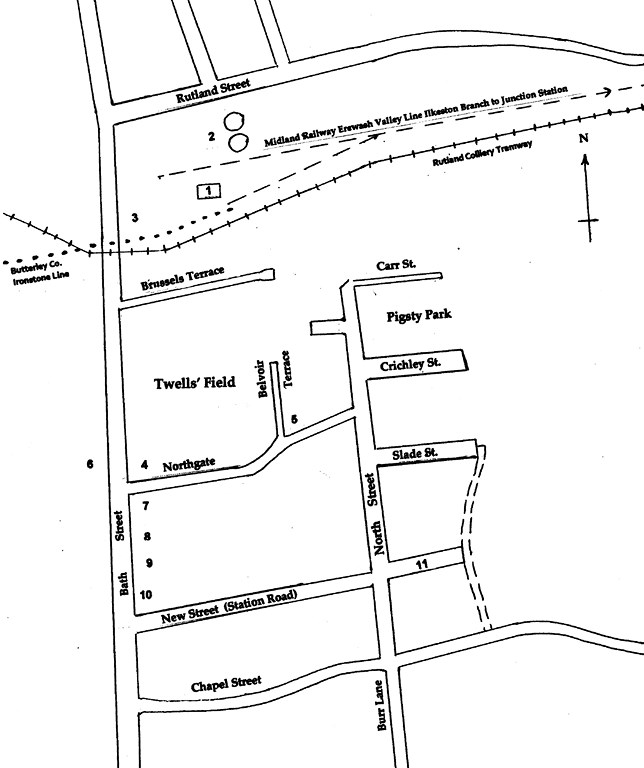 On the western side of Bath Street across from the Town Station, toiled the Rutland collieries and ironstone quarries. A wagon-way incline ran from them and crossed over Bath Street going to the Erewash Canal and Ilkeston Junction, thus facilitating coal to be transported from its origin and on to its markets. The first task of prospective rail travellers therefore, was to negotiate safely two dangerous tramways at the entrance gates to the Town station. (At this time ironstone pits were not subject to the same Act of Parliament as coal pits. No notice had to be given to Government Inspectors when a death occurred. The works were consequently often very unsafe and the pit mouth unguarded. In addition the pits were exempt from local rates).