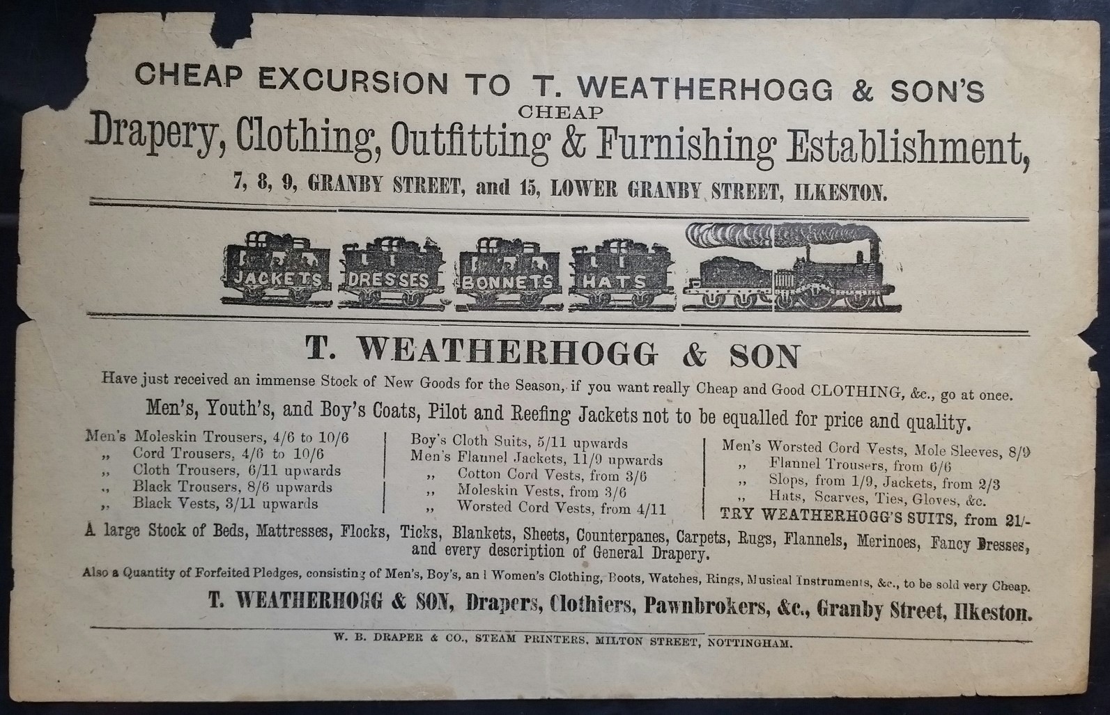 Stop Press !! October 1875. All the above items have been recovered … found in the hands of furnaceman George Wimbush, engine driver John Allen, aged 26, shoemaker William Jacques, aged 31, and shoemaker John Stephens, aged 26. … in properties at William Street and Tutin Street in Ilkeston, and at Pye Bridge near Alfreton.