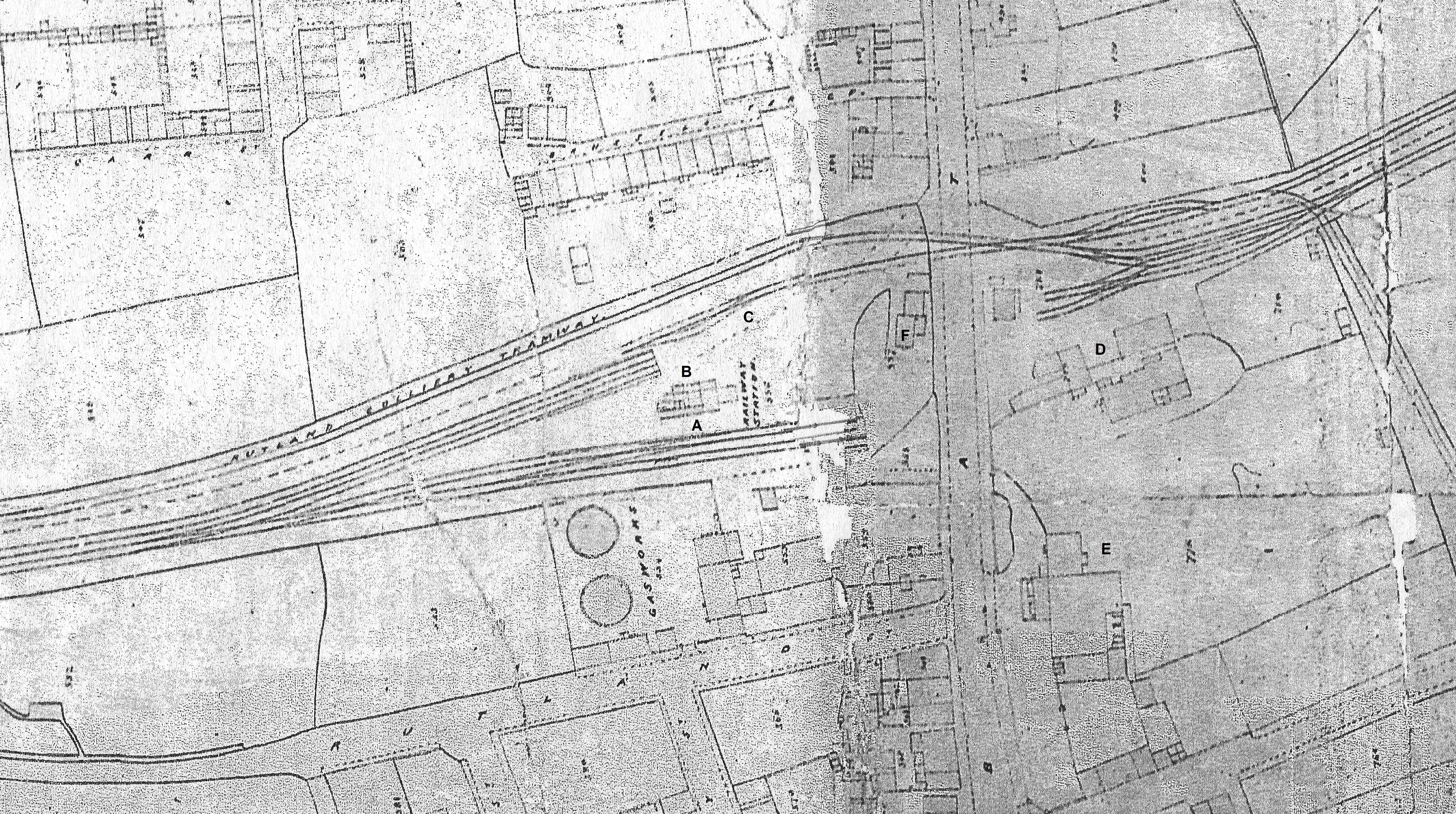 The railway station is also named (though not too clearly). At A is the single platform for passengers, while on the other side of the station building, at B, is the goods wharf. You can see separate railway lines serving each. The Rutland Colliery tramway is named on the original map, while Messrs Jessop & Co of the Butterley Company had their ironstone tramway, which terminated at the goods wharf, is marked as C. They had started the ironworks about epetember 1846.