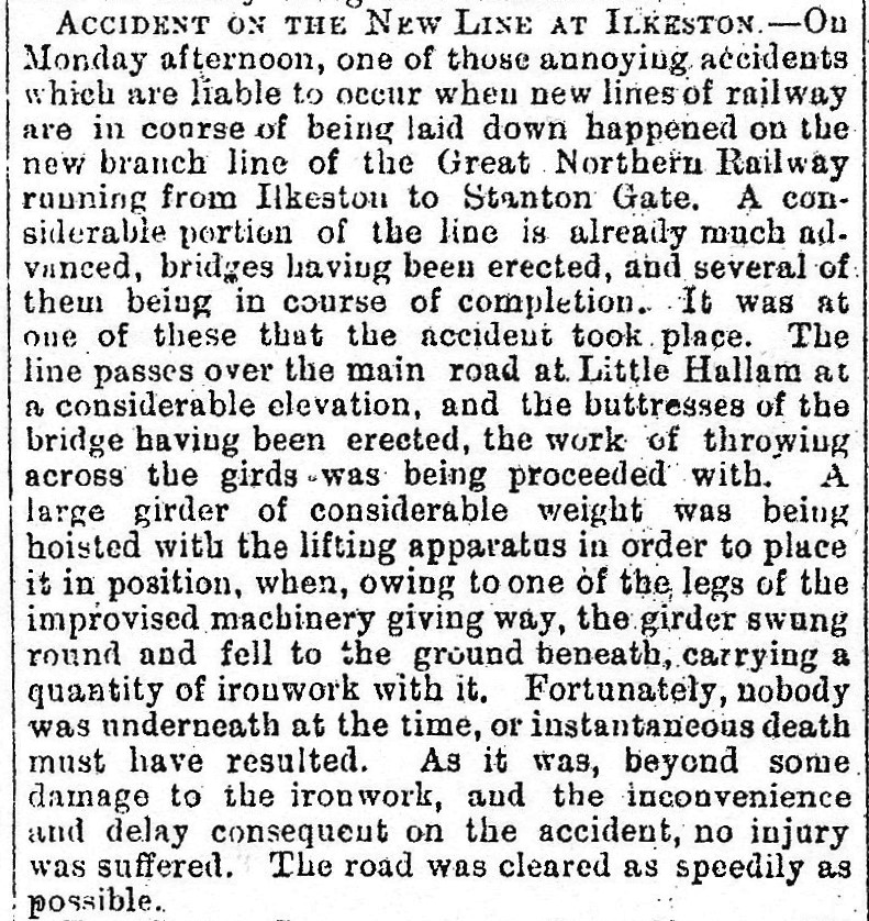 The Great Northern Railway extension of 3¾ miles between Ilkeston and Heanor Gate was commenced, using 200 men and 20 horses at the Heanor end. Several bridges had already been partially constructed and the opening was scheduled for the end of the year. A short line from the Heanor end to a new line to Nutbrook Colliery had been completed. The station at Heanor would be within half a mile of the centre of town.