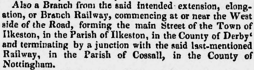 In November 1836 the Midlands County Railway set out its plans to extend its network. This included plans for a branch line from Bath Street to Ilkeston Junction station at Cossall. When the ‘Branch Railway’ was actuially built, it ran from the east side of Bath Street and not the west side as the Derby Mercury stated.