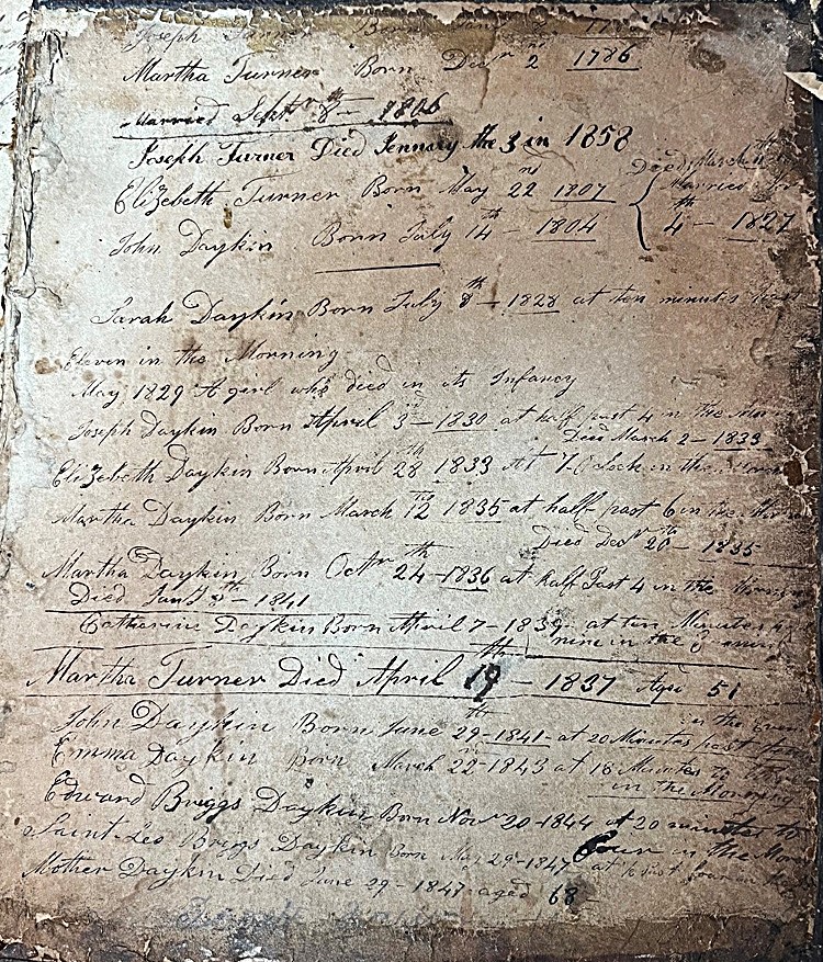 Martha Daykin was born at half past six in the morning (?) on March 12th, 1835; she died on December 20th, 1835 and was buried three days later, at St. Mary’s Church.