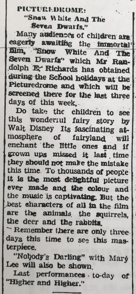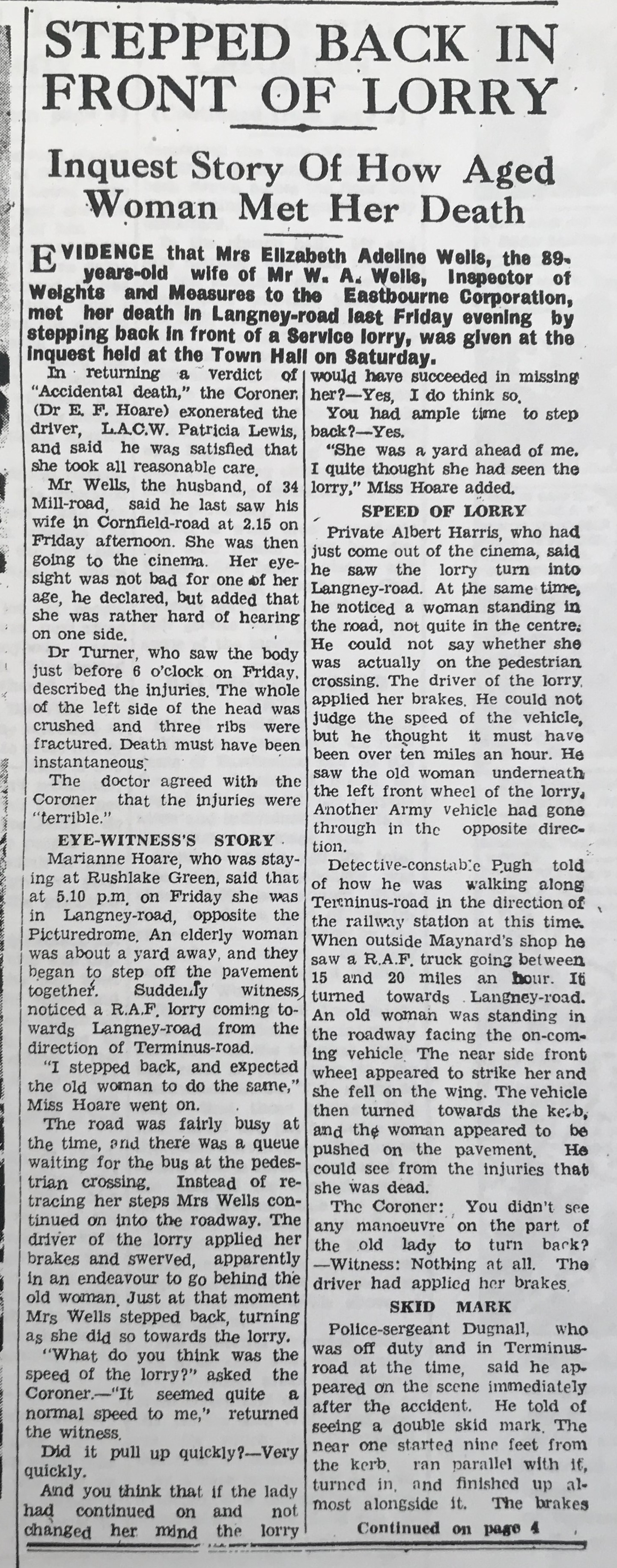 It was Friday and Adeline had left her husband at 2.15pm in Cornfield Road to go to the Picturedome cinema in Langney Road. She was about to see Walt Disney’s ‘Snow White and the Seven Dwarfs’, which the cinema had obtained for part of the school holidays, and stayed to see the support ’feature’, the musical ’Nobody’s Darling’. Coming out of the building just after 5pm, Adeline stepped off the pavement in front of an R.A.F. lorry driven by L.A.C.W. (Leading Aircraftwoman) Patricia Lewis, a member of the Women’s Auxiliary Air Force. Despite braking and swerving, the lorry hit Adeline, causing severe and fatal injuries to her head and chest.