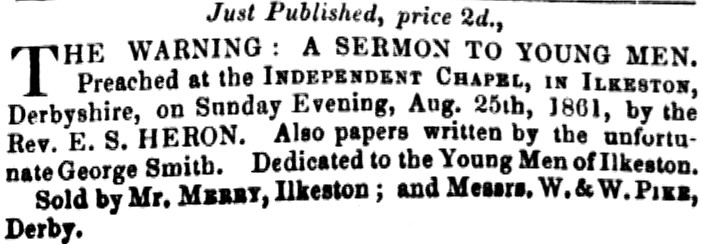 On Sunday August 25th 1861 the Rev. Heron’s sermon at the Ilkeston Independent Chapel, delivered in the morning and evening, considered the sad history of George Smith. The chapel “was crowded to suffocation on both occasions” such that hundreds were unable to gain admittance. This sermon was subsequently printed, with two others delivered by the Vicar of St Mary’s, one just after the murder and the other just before the execution.