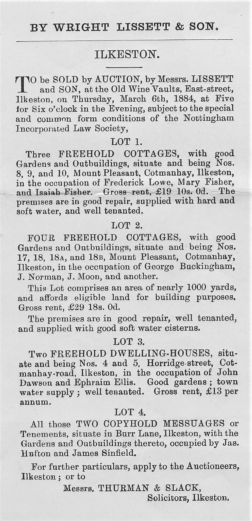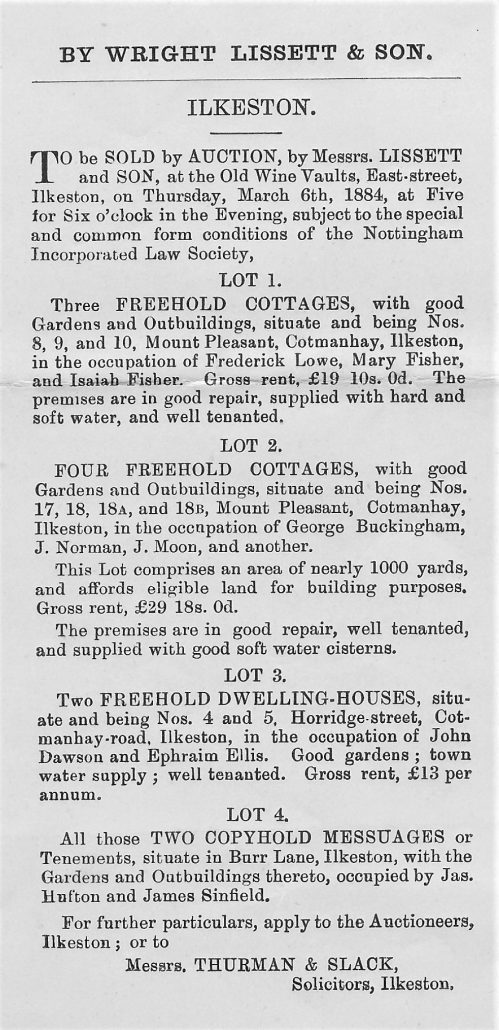 I’m pretty sure that John had no interest in purchasing property in Cotmanhay, at Mount Pleasant or Horridge Street, but was certainly keen to expand his Burr Land holdings … and Lot 4 gave him that opportunity.
