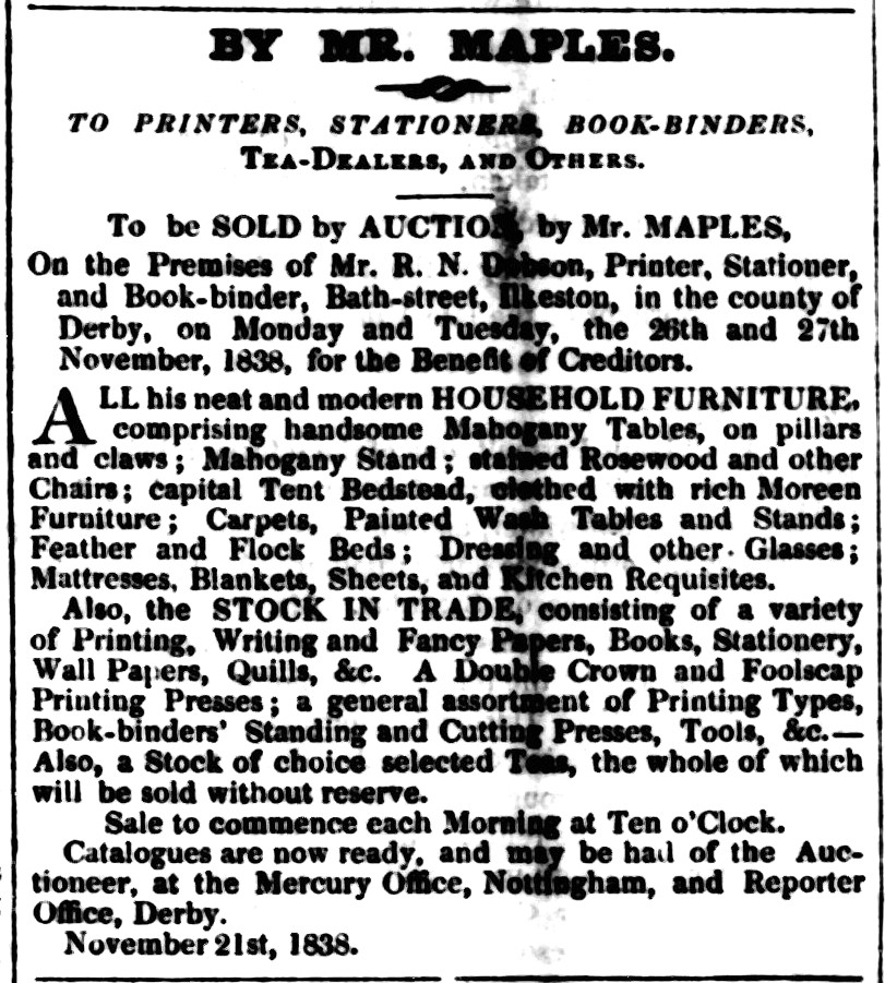 Ralph Ness Dobson sells up (Nottingham and Newark Mercury, November 24th, 1838)