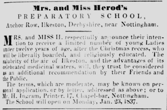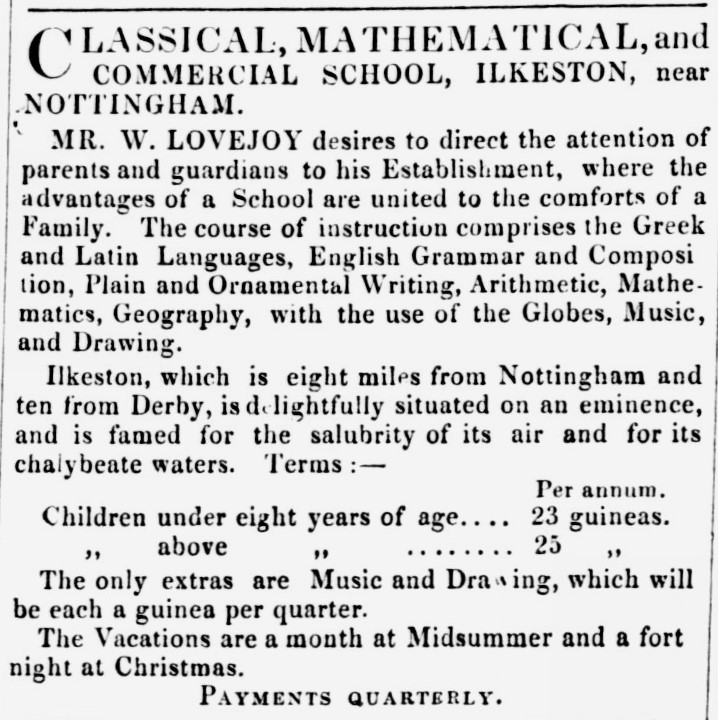 — and for those of a ‘higher order’, who could resist the charms of Ilkeston or the new School of William Lovejoy, as advertised in the Nottingham Review of July, 1850 ?