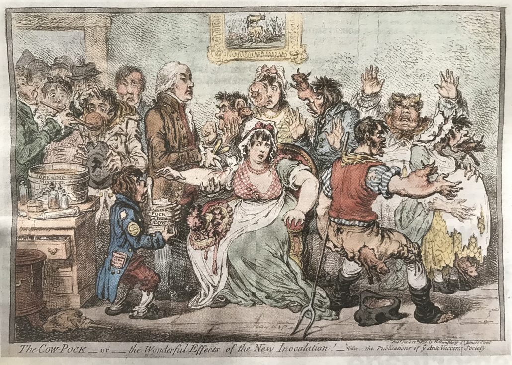 The word ‘vaccination’ was first used in connection with the work of Edward Jenner at the end of the eighteenth century when he used a cowpox virus to help develop a smallpox vaccine. You can see him in the cartoon (above) showing ‘the wonderful effects’ that his treatment had on patients.