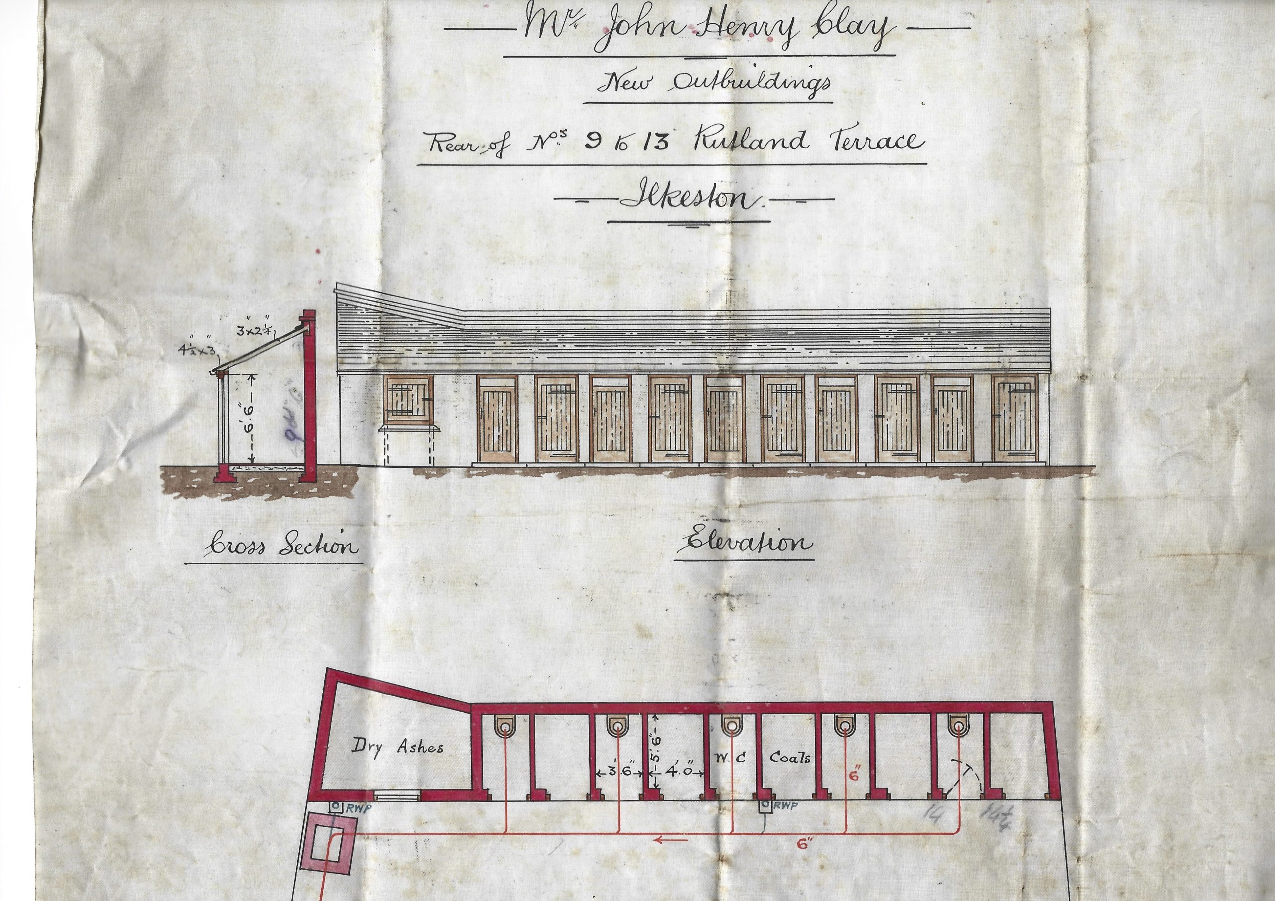 Rutland Terrace was a group of houses off Rutland Street, close to Ilkeston’s Gas works, while John Henry Clay was the grandson of Henry Lever Clay, landlord of the Mundy Arms. As you will see the planned ‘outbuildings‘ included a communal shed for the dry ashes and a coal-house and toilet (each with a 6 inch waste pipe) for every of the houses.