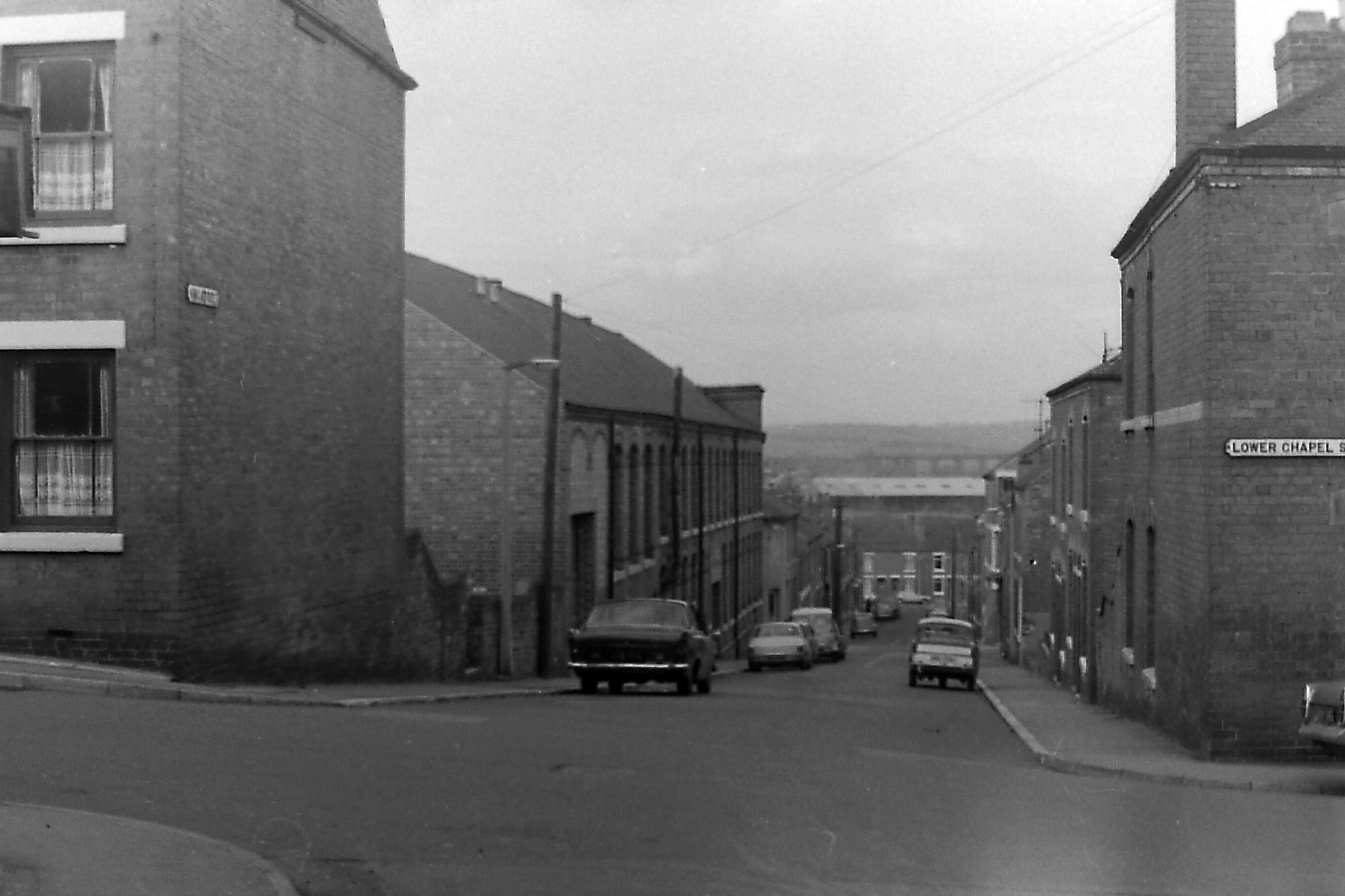 This road was glimpsed in the previous photo. These are the houses on the north side of the road as it approaches Bath Street (just off the extreme right). The old Manor Ground football ground stood on the left of the houses.
