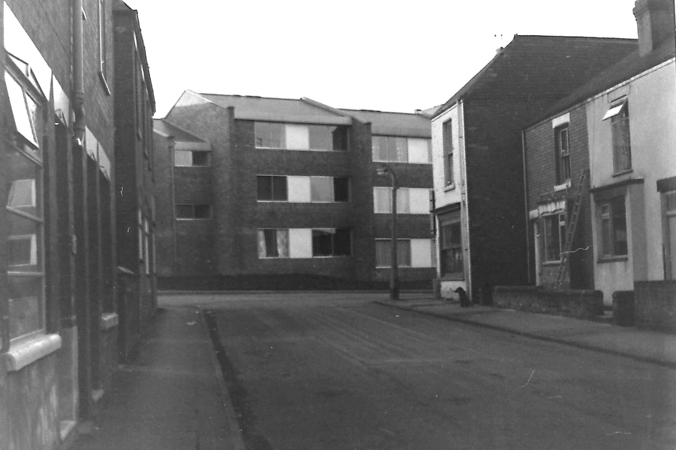 The photo shows the western end of Mill Street where a new block of flats in Wood Street has just been built.