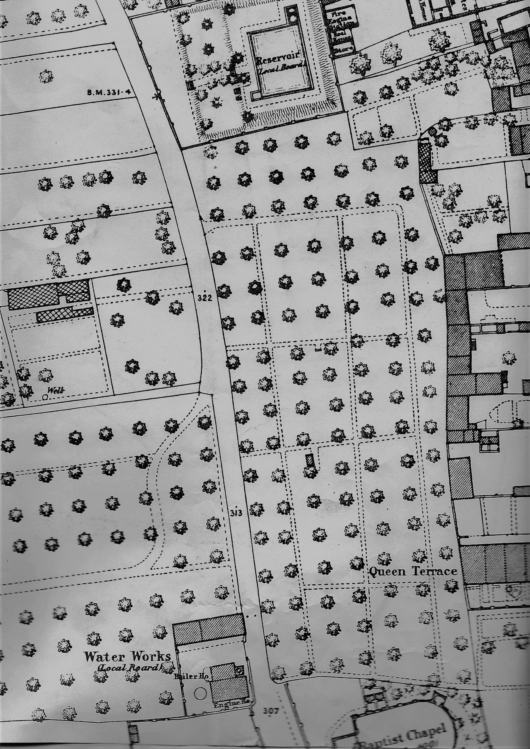 The site of the reservoir, mentioned above, which later was the site of the new simming baths, was at the end of the extension, behind the trees on the left.