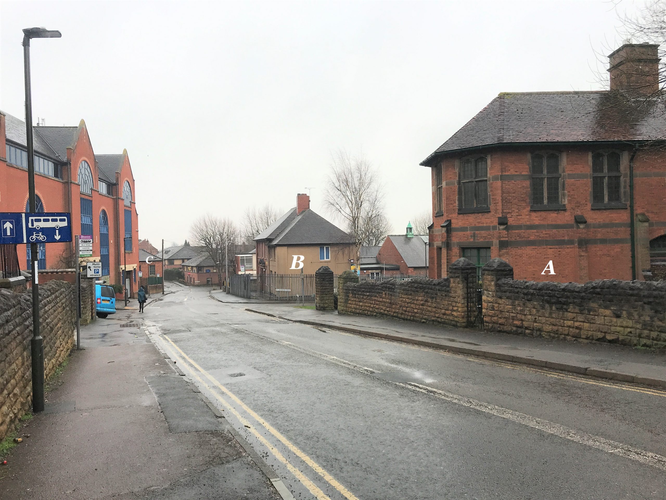 A is part of the Congregational Church. B is the Derbyshire Army Cadet Force Centre, hidden behind which is the Flamsteed Centre, site of the old Waterworks. C is the corner of Queen Street where the new Baptist Church stands