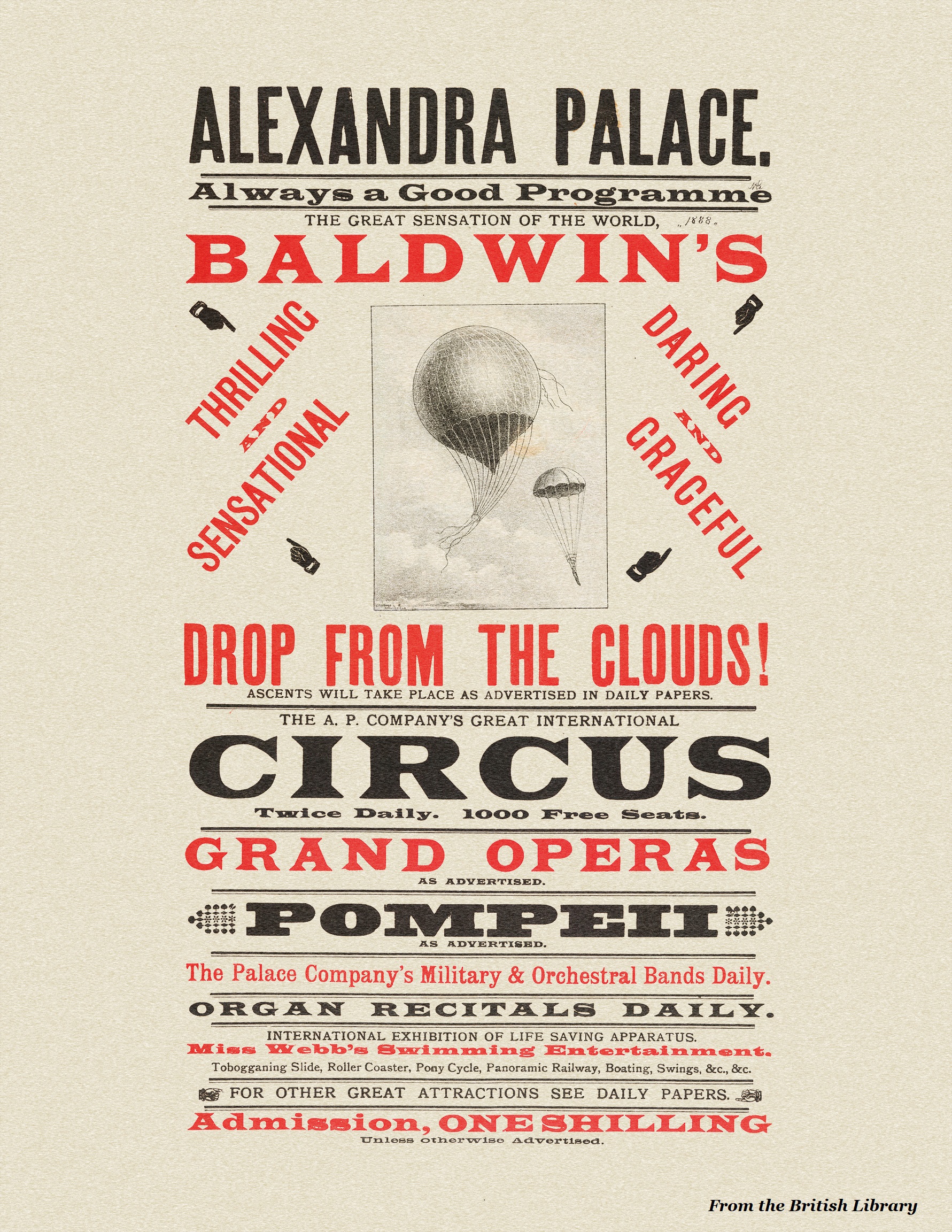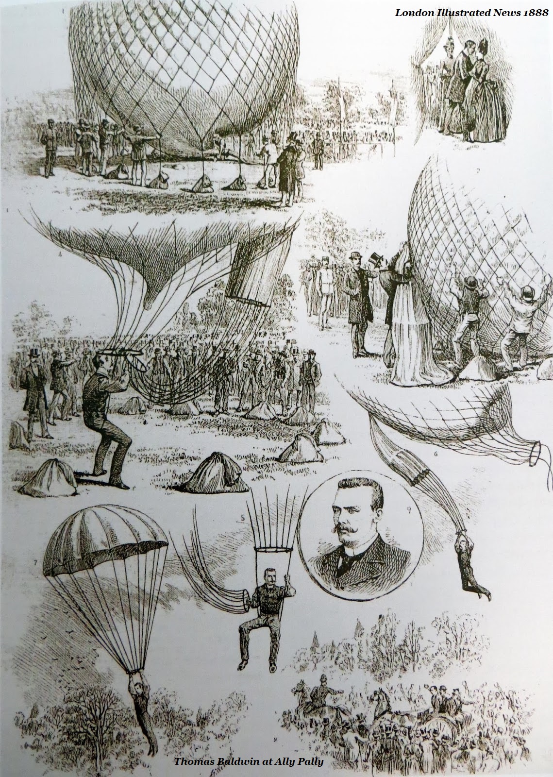 Thomas Baldwin at Ally Pally 1888, from the Illustrated London News … his drop from the sky, the first American to descend from a balloon by parachute, his tenth jump.