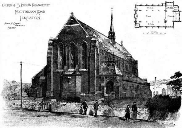 The Duke of Rutland had already a site to offer for the new church; it was on the west side of Nottingham Road but had one significant drawback. The custom of the Church of England was to build a church, running west to east, with the main entrance to the west and the chancel at the east end. A new church built on the Nottingham Road site would have the disadvantage that the congregation would be inconvenienced by having to walk along the whole length of the church to exit by the main west door. Edwin Canner J.P. of Stanley Grange came to the rescue however. He had a piece of land on the east side of Nottingham Road, and so with the Duke’s agreement, he adopted the simple solution of swapping properties. His Grace was thus able to bestow upon the trustees of St. Mary’s Mission Church a most suitable site for their purposes. It was about half an acre, large enough for a church, mission room and parsonage, though funds were not sufficient for the trusteees to finance all of these buildings. Thus plans were prepared by architect Percy Heylyn Currey of Little Eaton, Derby, for a plain brick building, including only a nave and south aisle, and holding a congregation of 300 — further features, like a north aisle, chancel, organ chamber and vestries, could be added later. The building was to be in the Early English style, the front being of plain red heather brick with stone sills. Percy’s name as an ecclesiastical architect was “being recorded up and down the diocese in many monuments of his skilful designing” (Belper and Alfreton Chronicle)