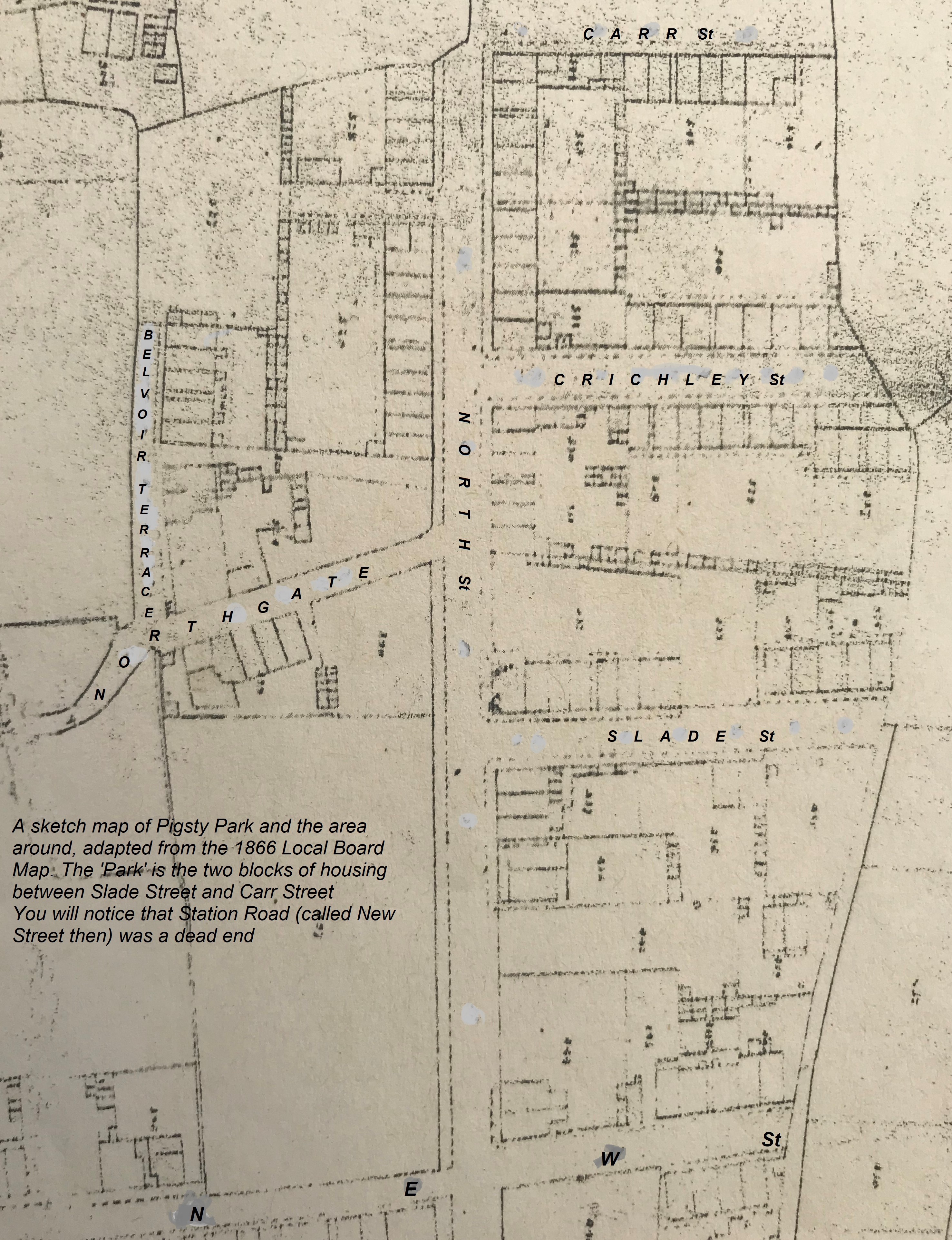 Adeline tells us ….“The upper field was turned into building plots, but it was not very attractive, in fact the road was so bad that one member of the Local Board said that the road was worse than a pigsty. The name caught on, and for many years that part of the town was called ‘Pigsty Park.’”