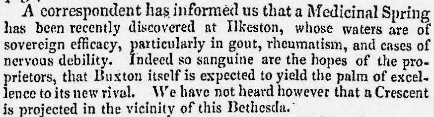 In October 1829 the Derby Mercury was alerted to the recent discovery of a ‘Medicinal Spring’ at Ilkeston and its powers to conquer gout, rheumatism and nervous debility.