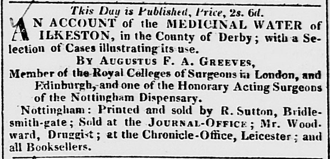 Thus wrote Augustus Frederick Adolphus Greeves (M.R.C.S), a visiting honorary acting surgeon of the Nottingham Dispensary, who recorded all of this in ‘An account of the Medicinal Water of Ilkeston’ published in 1833.