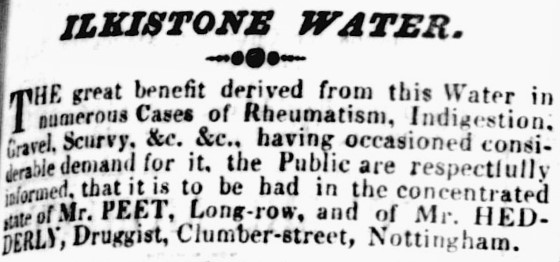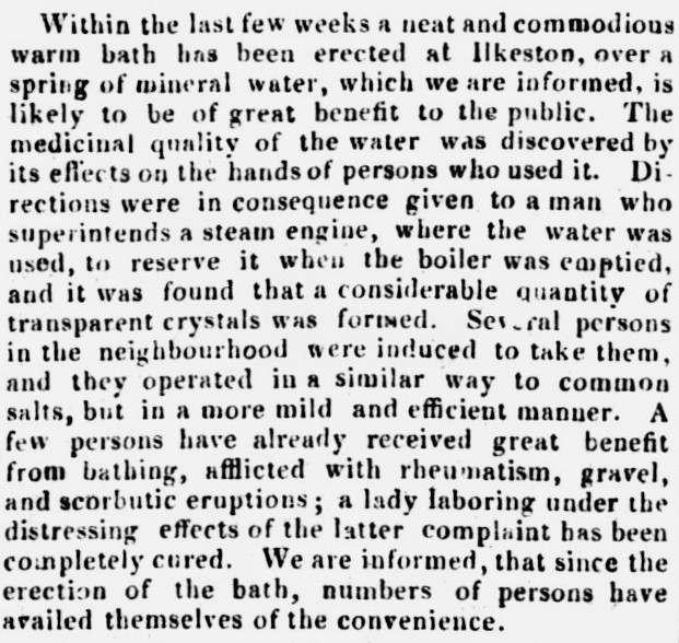 And then, in May 1838, the Derby Mercury announced that Concentrated Ilkeston Water was now available in greater quantities — thanks to additional apparatus. Application of this liquid, either internally or externally, would help cure, scurvy, leprosy, scrofula, spasmodic affections, liver complaints, rheumatism, gravel, paralysis, gout.