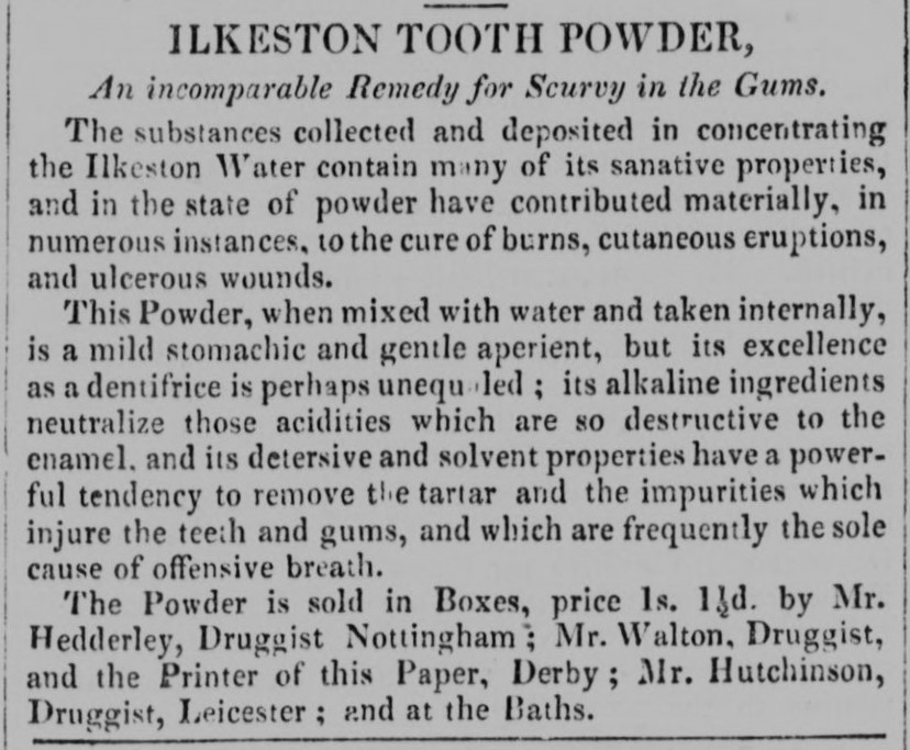 The Leicester Chronicle (September 1831) also recommended ‘The Ilkeston Tooth Powder’, “a sediment from the Ilkeston Water, possessing its sanative properties, and an excellent remedy for scurvy in the gums”.