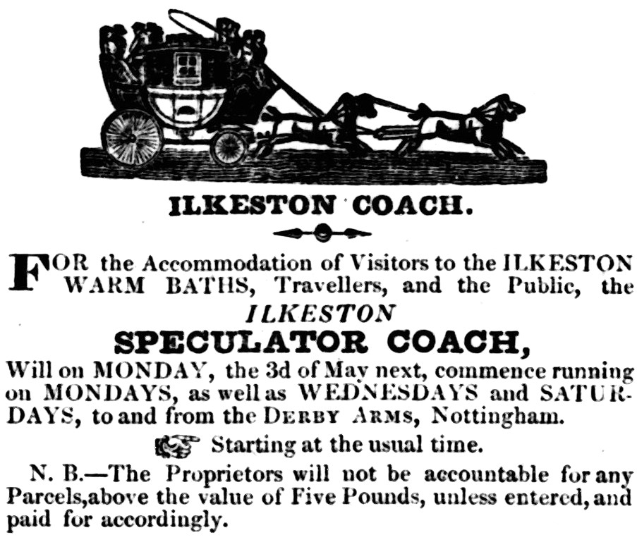 In April 1830 the Derby Mercury was now reporting the continued success of these mineral waters such that several new Baths were being built, some with suitable apartments. And in that same month the Nottingham Journal and others were explaining to prospective visitors from that city how they could travel to their Derbyshire neighbour …. “The Ilkeston Speculator Coach will on Monday 3rd of May commence running on Mondays as well as Wednesdays and Saturdays, to and from the Derby Arms, Nottingham, starting at the usual time”.
