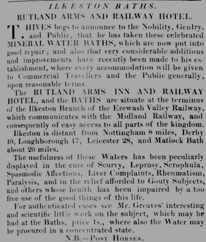 Not too confidently (and incorrectly) Adeline declares that “in 1844 or thereabouts a warm mineral spring was discovered at the side of the Rutland Arms, and this was expected to become a great asset to Ilkeston”.