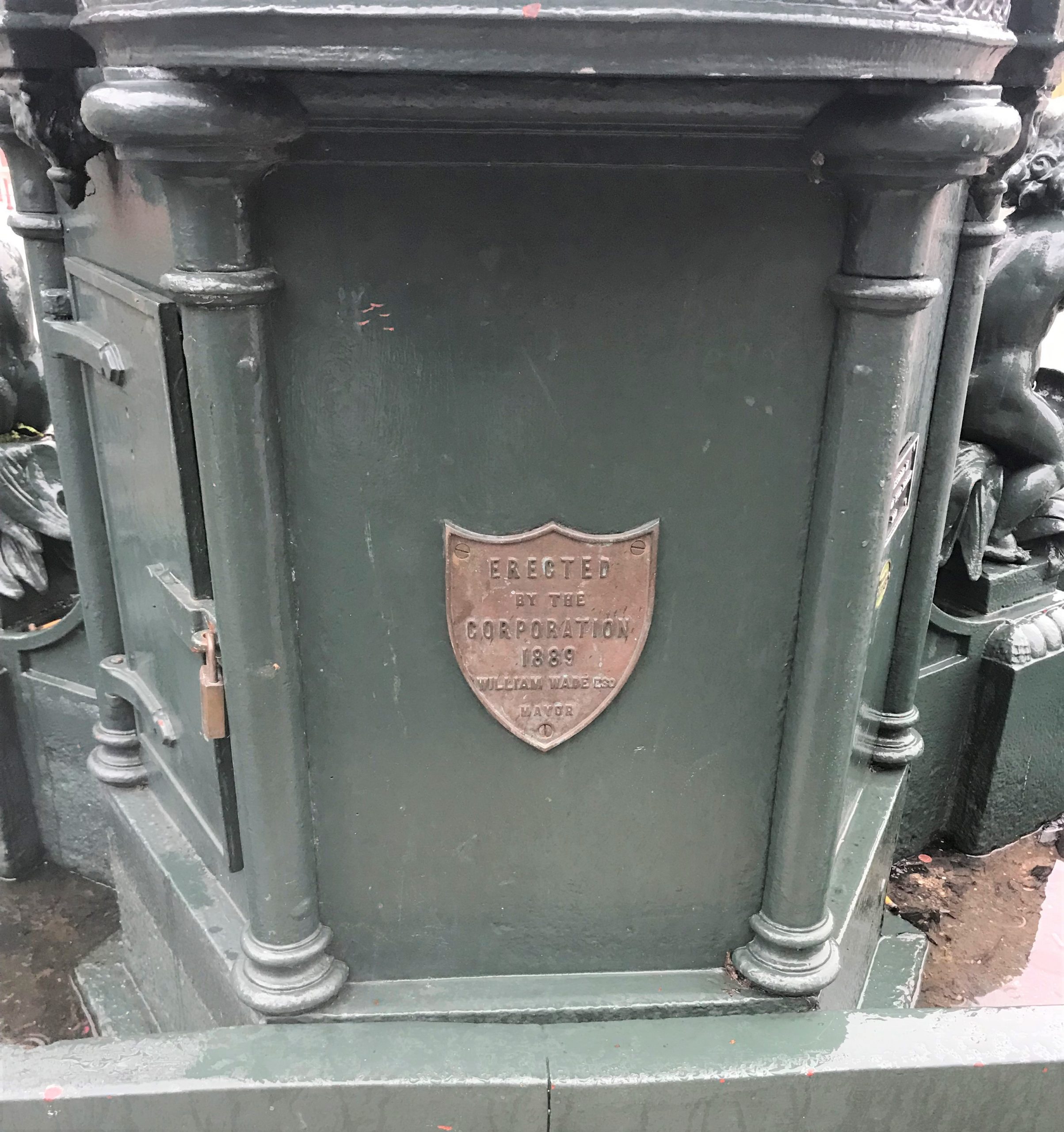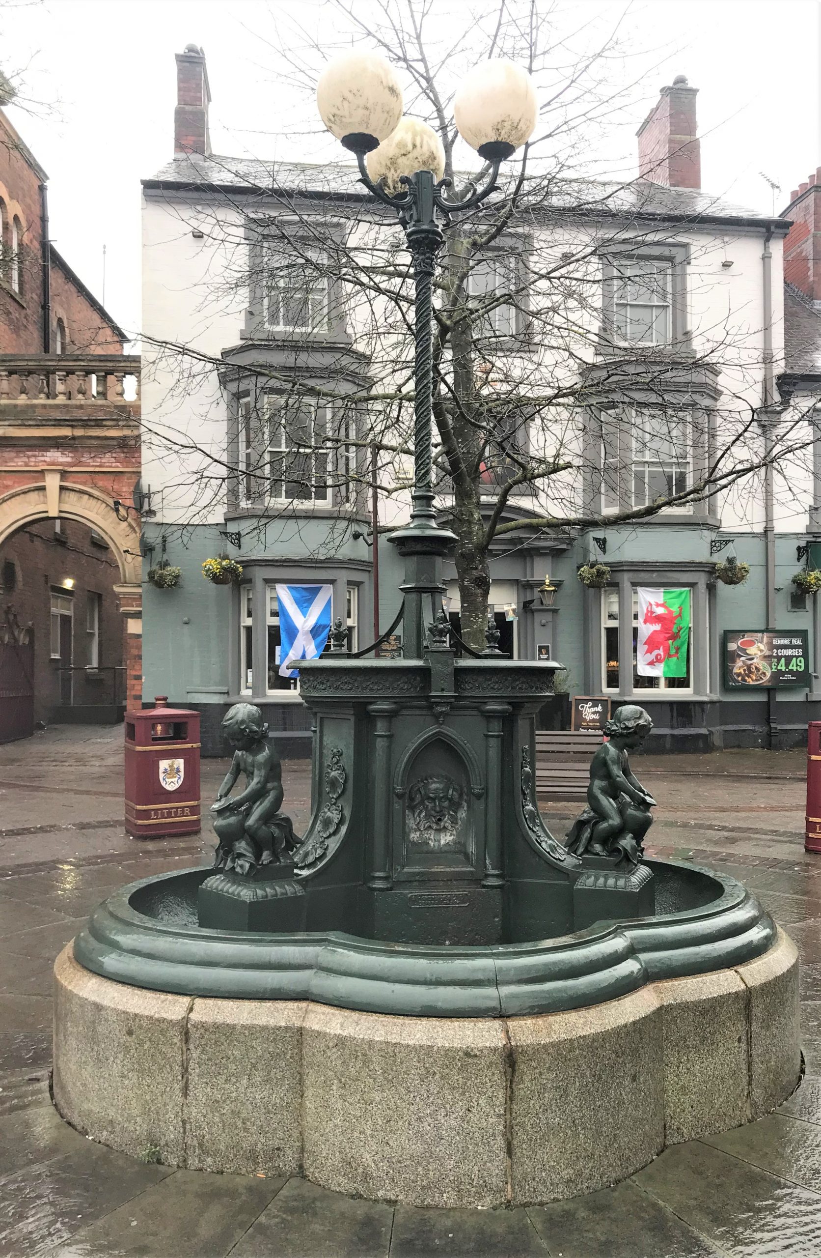Ilkeston’s public fountain, with the Sir John Warren Inn in the background (2022)
