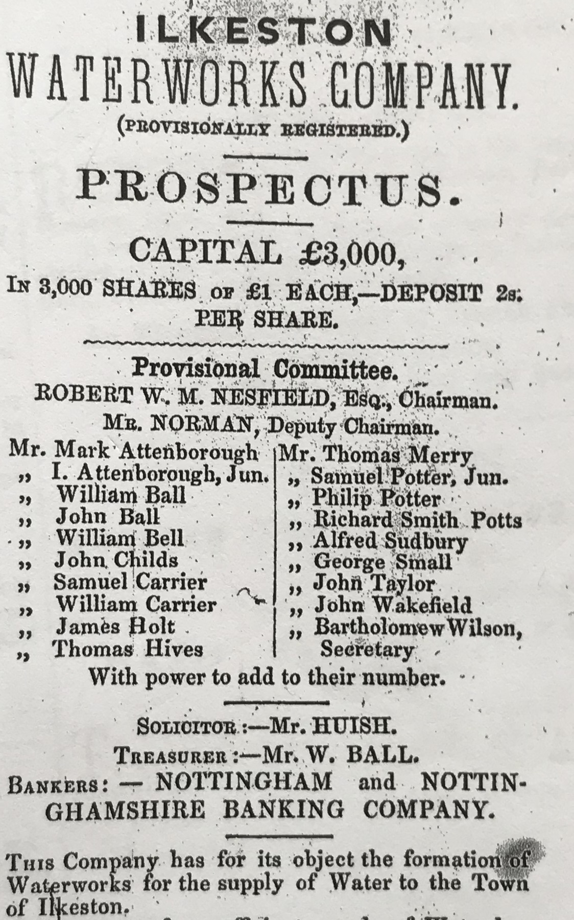 Ilkeston Waterworks Company was provisionally registered as a private company in May 1854, with its chairman Robert William Mills Nesfield, deputy chairman George Blake Norman, secretary Bartholomew Wilson and treasurer William Ball.