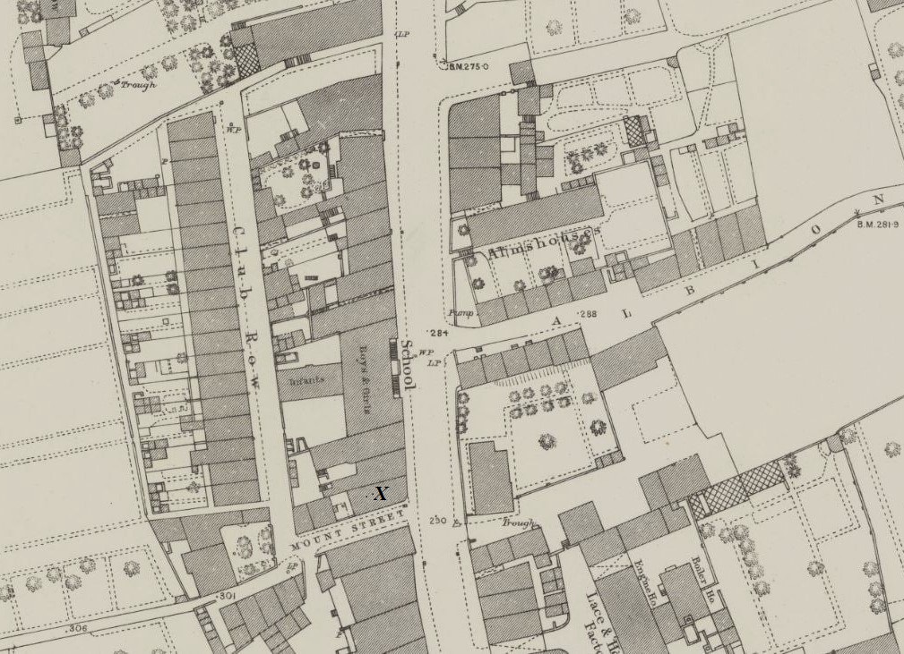 Here’s the area about 1880 — Albion Place on the east side of Bath Street, just south of the Alms Houses, and opposite the British School.