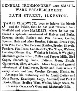 By 1844 James was a ‘smallware dealer’ and he died as a ‘general dealer’ in 1872 — between those two years he was also styled as a grocer and an ironmonger.