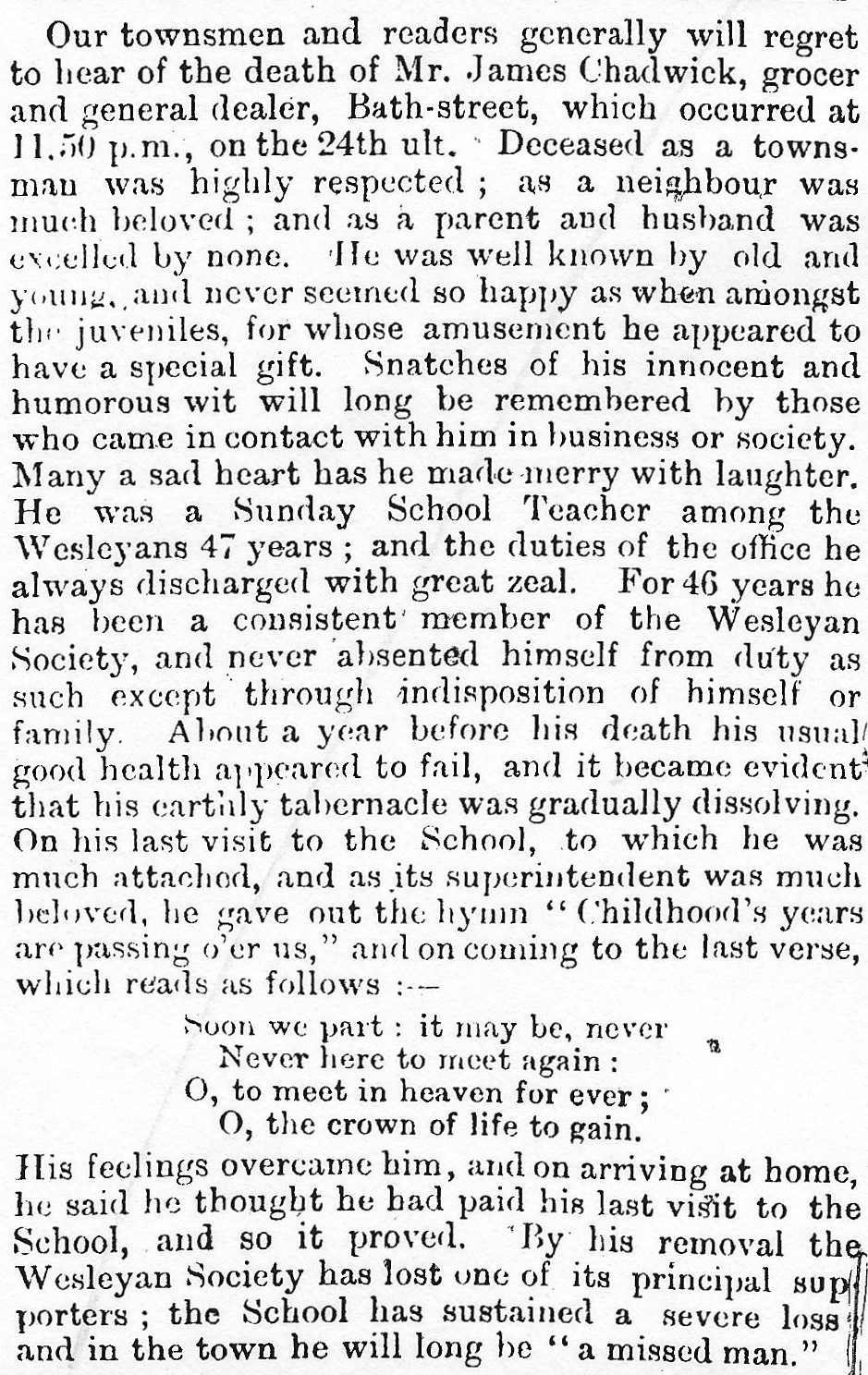 “his feelings overcame him, and on arriving at home, he said he thought he had paid his last visit to the School, and so it proved. By his removal the Wesleyan Society has lost one of its principal supporters; the School has sustained a severe loss; and in the town he will long be ‘a missed man’”.