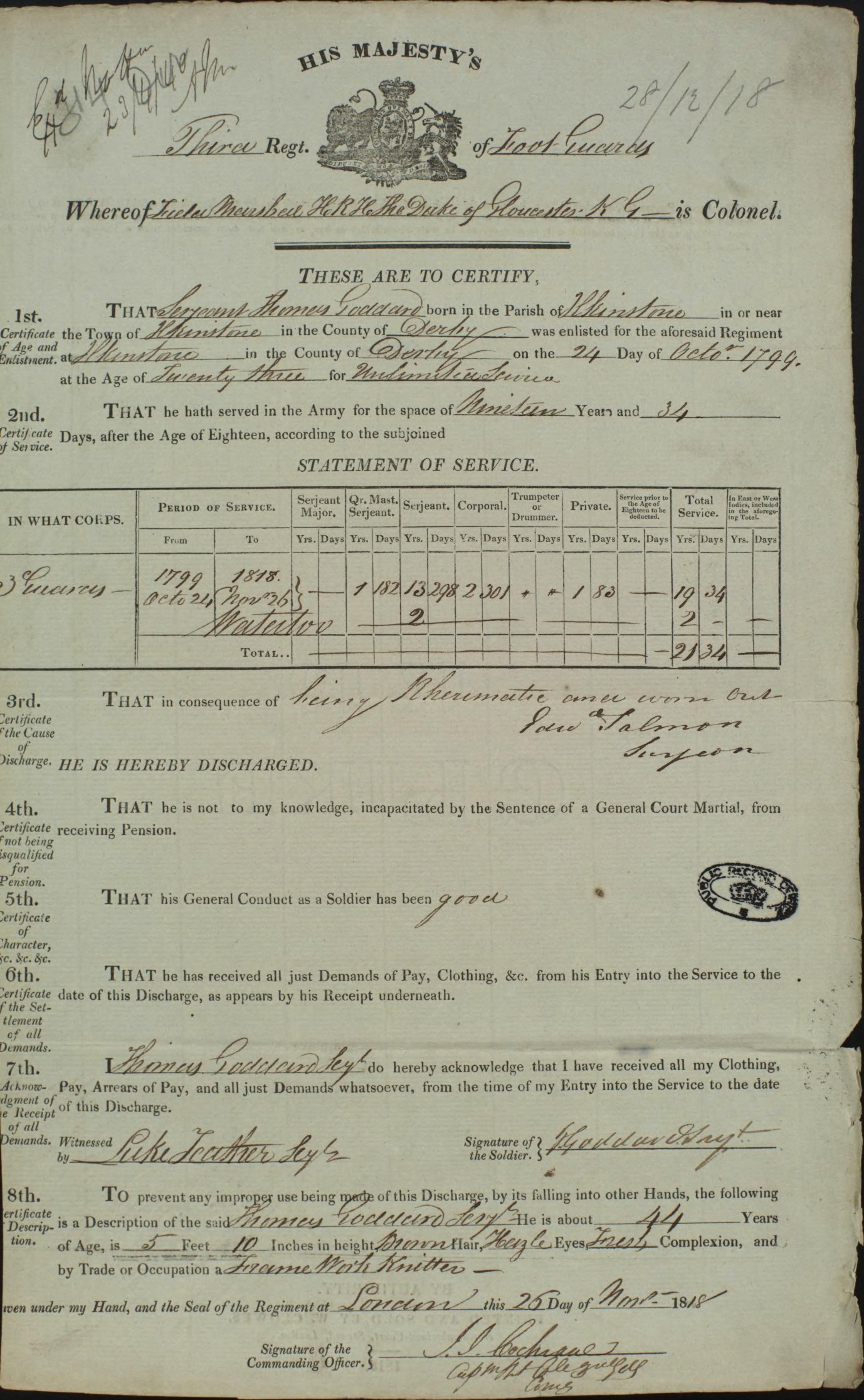 After just over 19 years of service, Thomas, then a serjeant, was forced out by rheumatism and being ‘worn out’. Enlisting in the 3rd Regiment of Foot Guards (Scots Guards), he had served at Waterloo (1815) and so was entitled to an extra two years service to be added to his army pension.