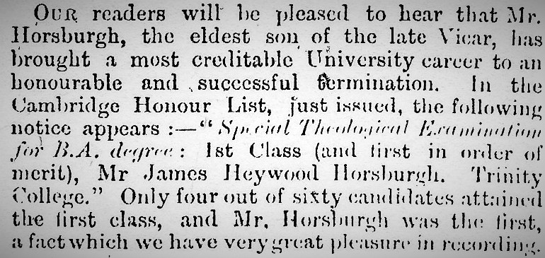 James’s eldest son was James Heywood Horsburgh who, as a young man, achieved great academic success, recorded in the Ilkeston Pioneer (Dec 18th 1873) …