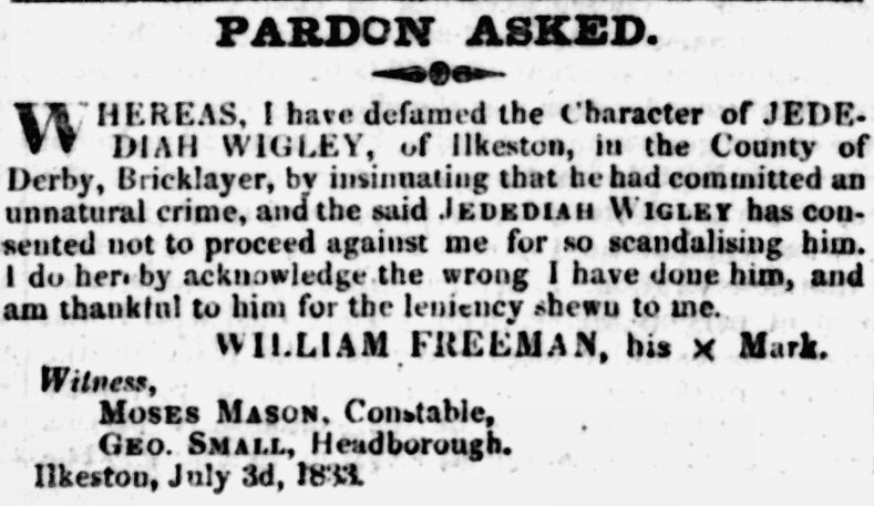 Notice in the newspaper declaration (below) that Moses Mason was the Parish Constable in 1833 before George Small took over; George was his Headborough or deputy constable at that time. Notice too that Jedediah was a bricklayer.
