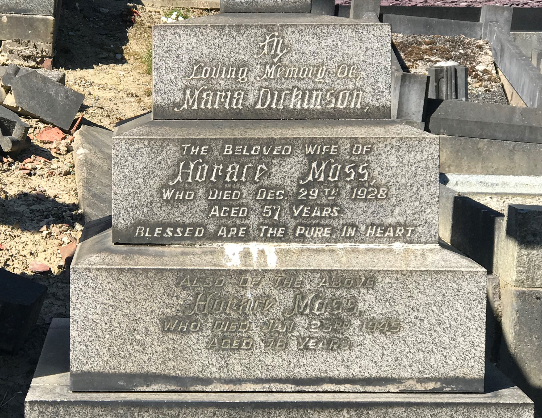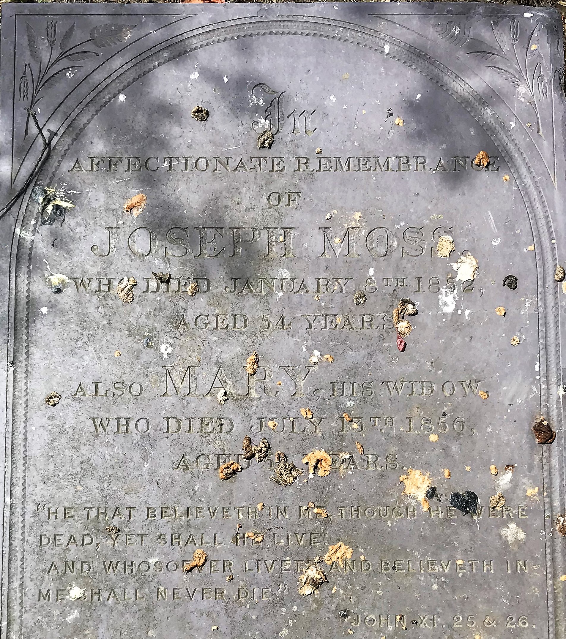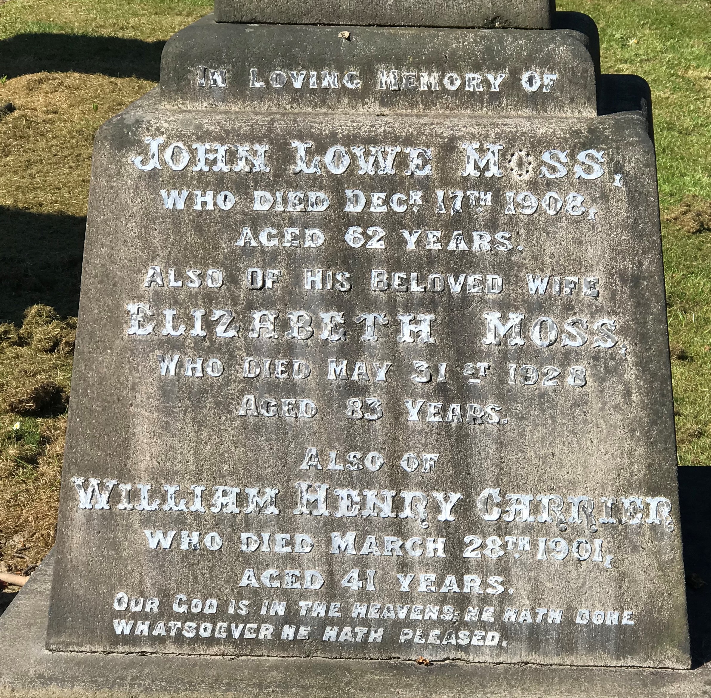 The photo above shows the Moss family graves. The monument, centre, is the stone of John Moss (1824-1894), his second wife Mary (1838-1926), and his daughters Mary Ann (1856-1901) and Ellen (1870-1933)
