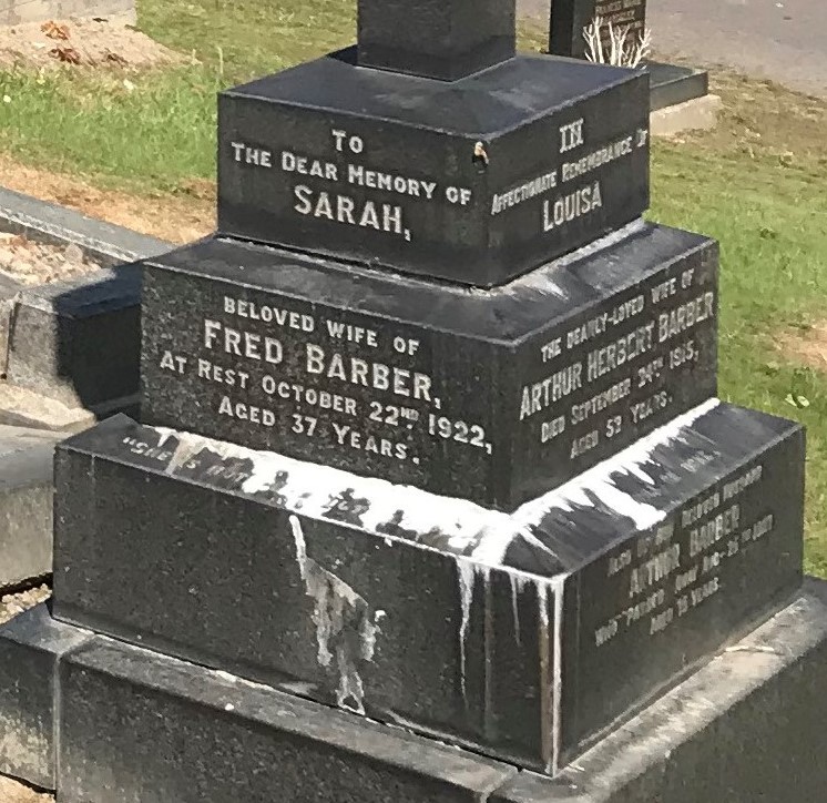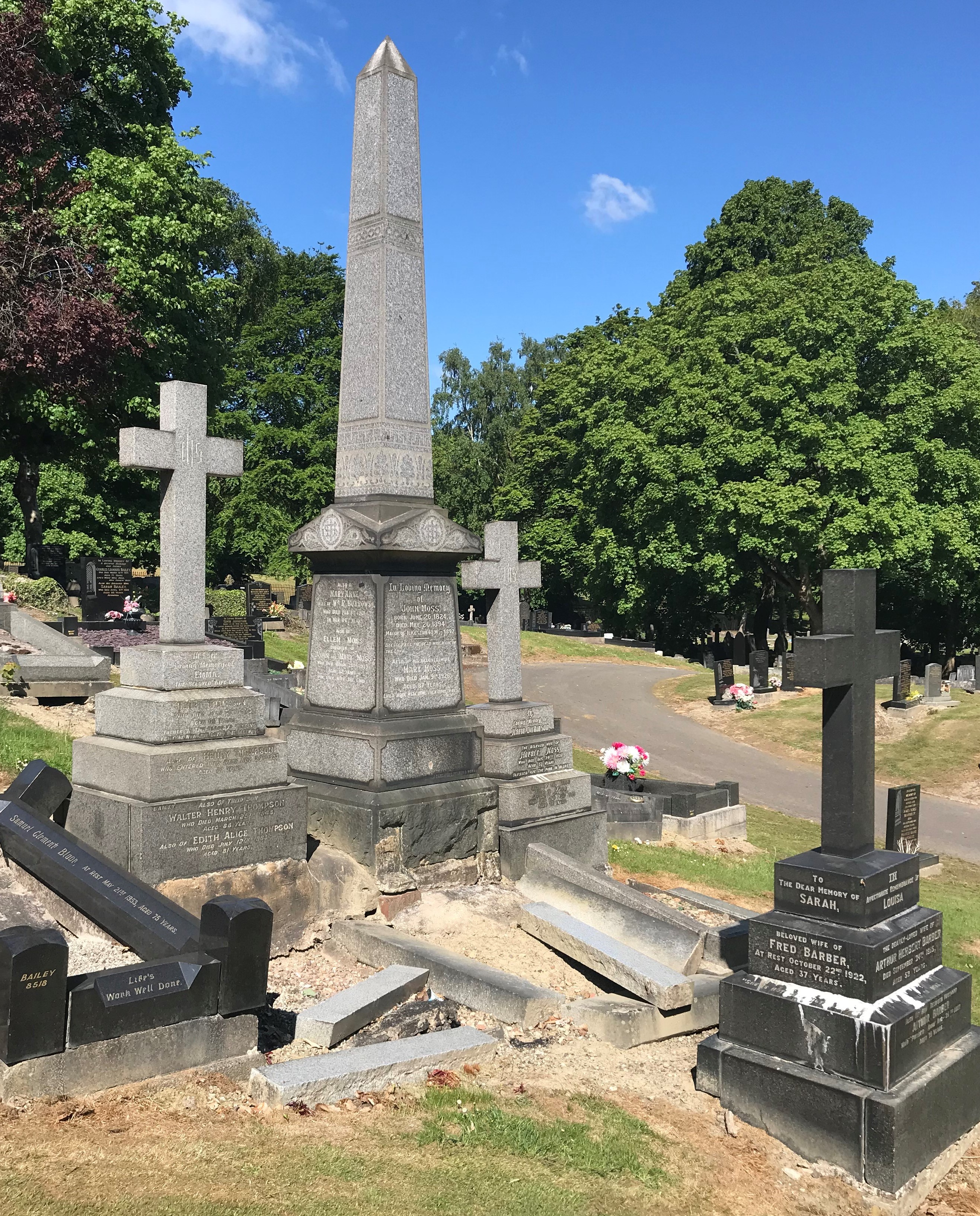 The black cross on the right marks the grave of daughter Louisa (1863-1915), married to Arthur Herbert Barber.
