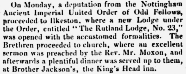 The ‘Monday‘ referred to in the article would have been April 7th, 1828. ‘Brother Jackson’ was William Jackson, landlord at the King’s Head — was this the one in the lower Market Place or the one at the corner of Pimlico ?