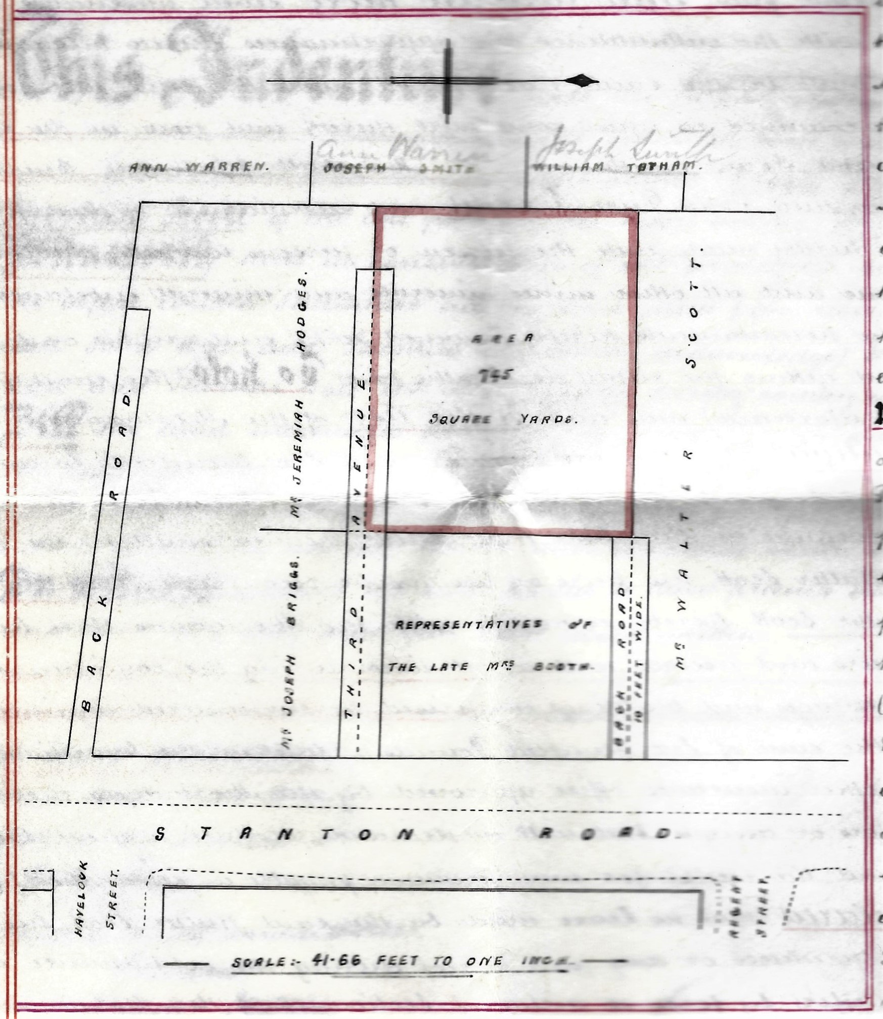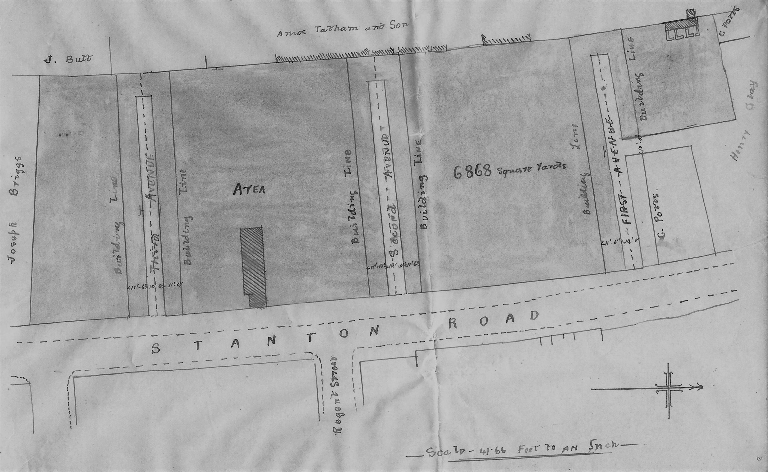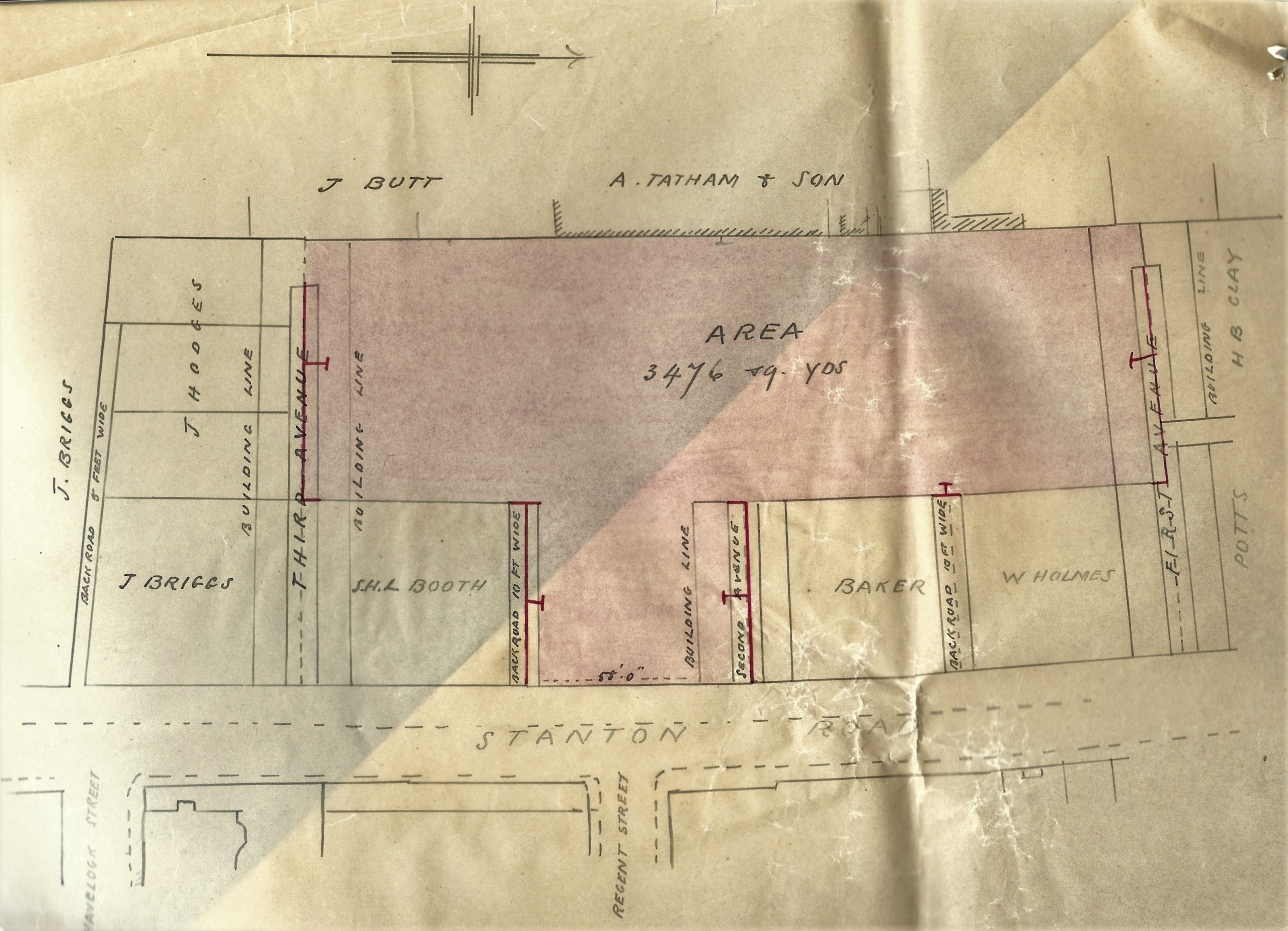 From March 1893 First Avenue was developed along with the prospective Second and Third Avenues. The sketch map above shows the people who held an interest in this area’s property. You should spot the names of Henry Clay, Charles Potts, Amos Tatham, James Butt and Joseph Briggs.