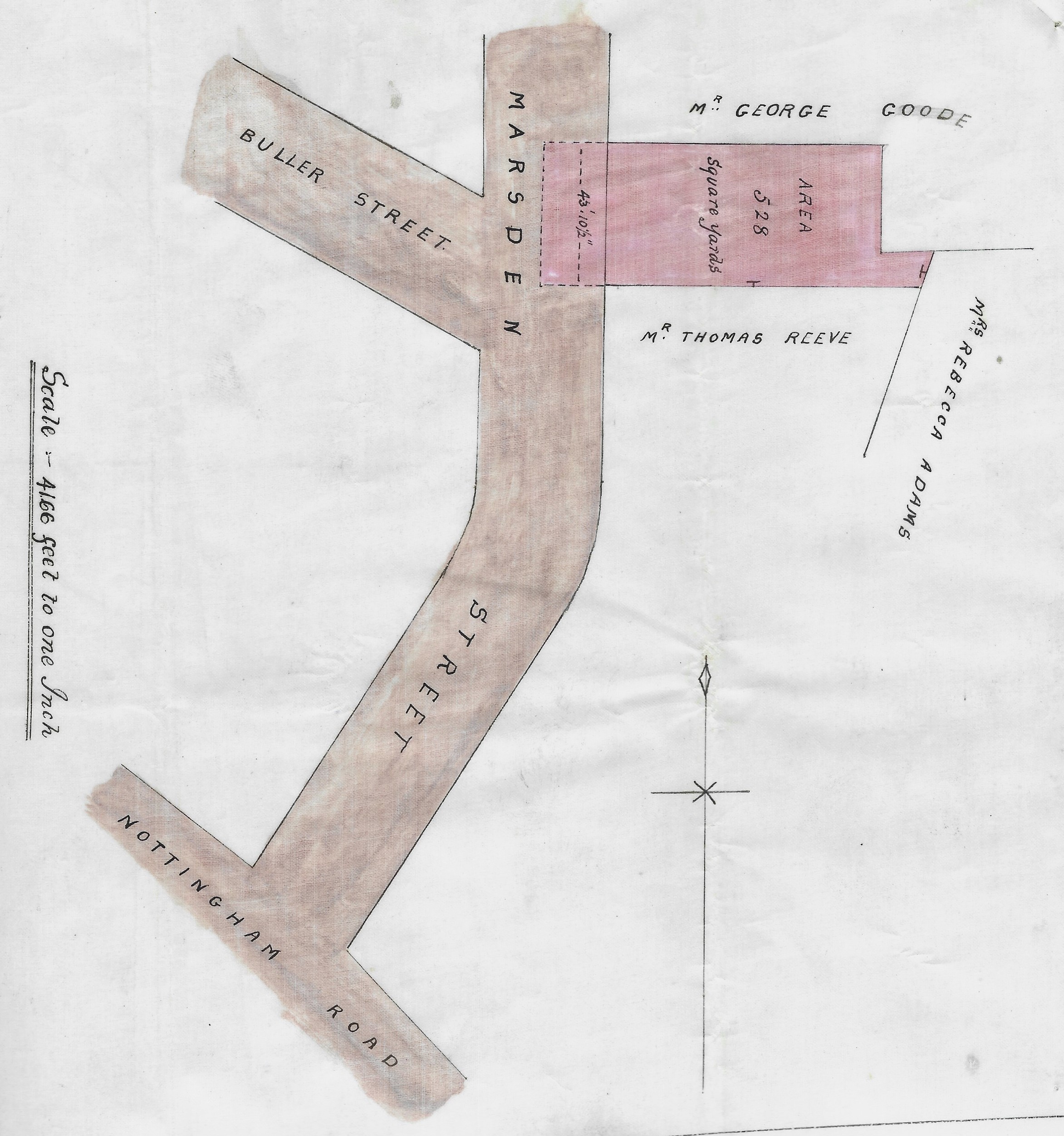 On August 15th, 1903 George Goode sold his portion of the land to Thomas Reeve, a builder living in Alvenor Street. It was then described as “having a frontage to Marsden Street formerly Roberts Street” and “of about 1527 square yards” and was a part of the area bordered in blue on the plan above. That part is coloured pink in the plan below.
