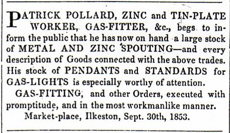 Born in 1829 tin and zinc worker, brazier and gas-fitter Pat Pollard was a son of Cotmanhay cordwainer Thomas and Elizabeth (nee Derbyshire).