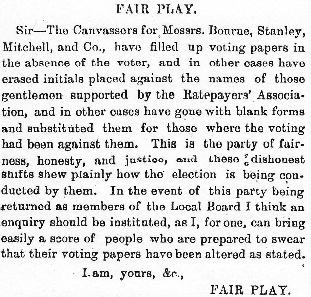 In April 1880, as was customary each year, six members of the Local Board were ‘retired’ and elections were held to find their replacements, although ‘retiring’ members could stand for re-election — as all of them did on this occasion.