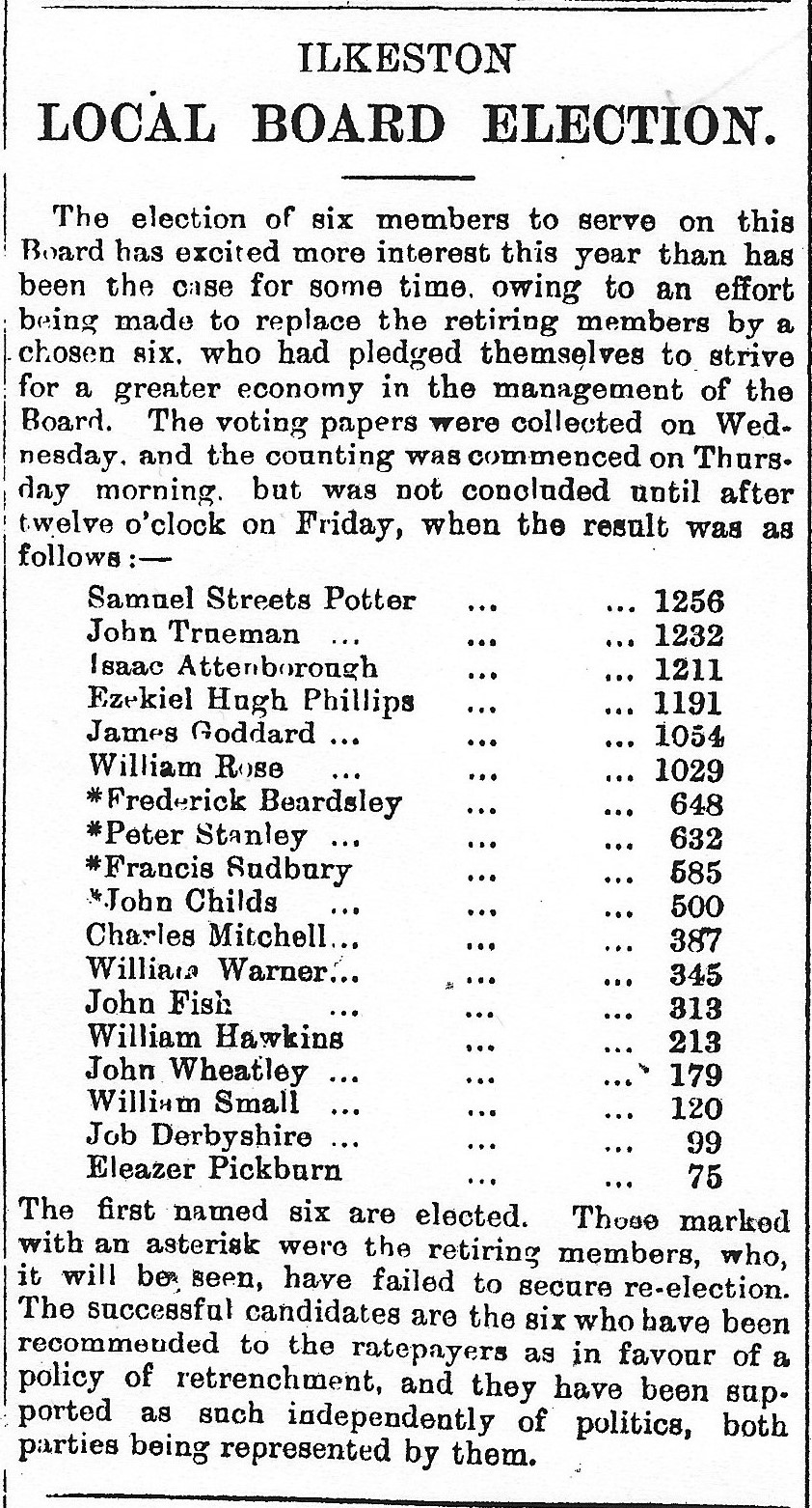 Twenty candidates were nominated for the six vacant seats, six of them running together on a joint ticket of ‘economy and retrenchment’. The Pioneer campaigned hard for the election of these candidates, who were Samuel Streets Potter, farmer of The Park; victualler John Trueman of the Durham Ox; Isaac Attenborough, maltster of Market Street; Ezekiel Hugh Phillips, colliery manager of Awsworth Road; builder James Goddard of East Street; and William Rose, auctioneer of Nottingham Road.