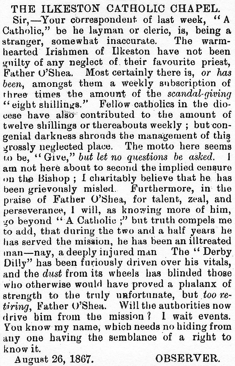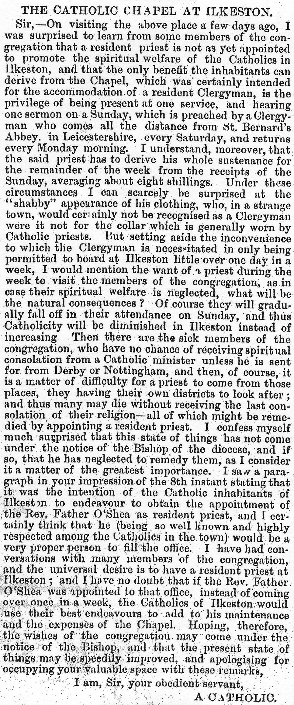 In 1863 Father McKenna left Ilkeston when he was appointed Missionary Rector of Derby and the congregation was again without a resident priest, having to ‘import’ a clergyman — the Rev. Father O’Shea, from St. Bernard’s Abbey in Leicestershire — to conduct one Sunday service each week….. a scandelous state of affairs, at least for one visiting Catholic….