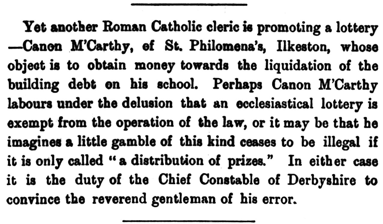 And in October of that year the Rev. Cannon McKenna of Derby returned to Ilkeston to help celebrate the 20th anniversary of the founding of the Catholic Mission there. He preached the evening sermon.