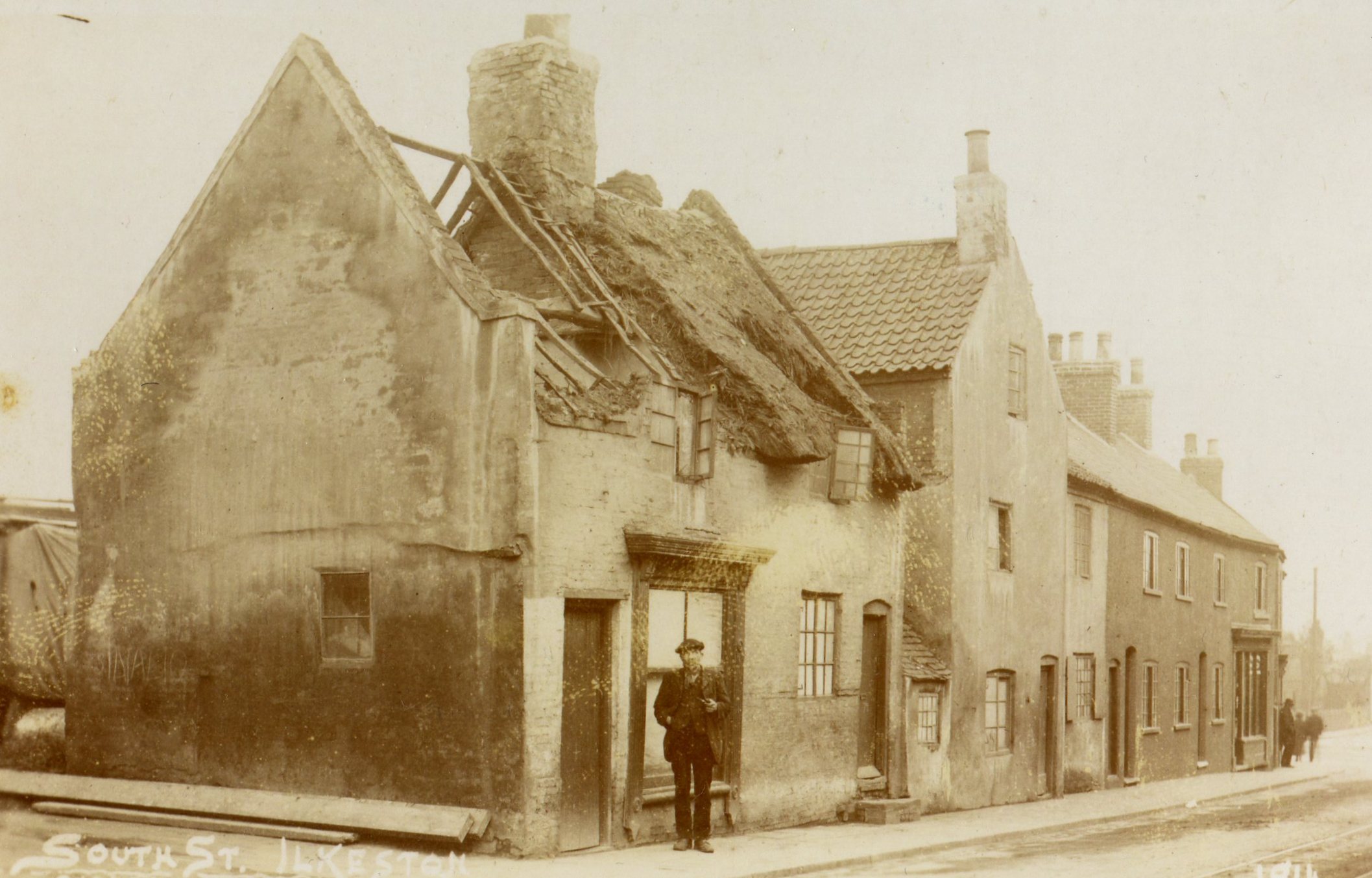 We are standing in South Street, looking at the entrance to Robey’s Yard on the left of the picture. (courtesy of Ilkeston Reference Library). The two thatched cottages were demolished in April 1914.