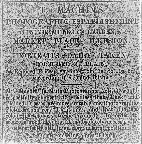 Deaf from birth, artist and photographer Thomas Machin was born in Burslem, Staffordshire about 1808 and seems to have spent only a short time in Ilkeston in the late 1850’s before moving on to trade in Belper.