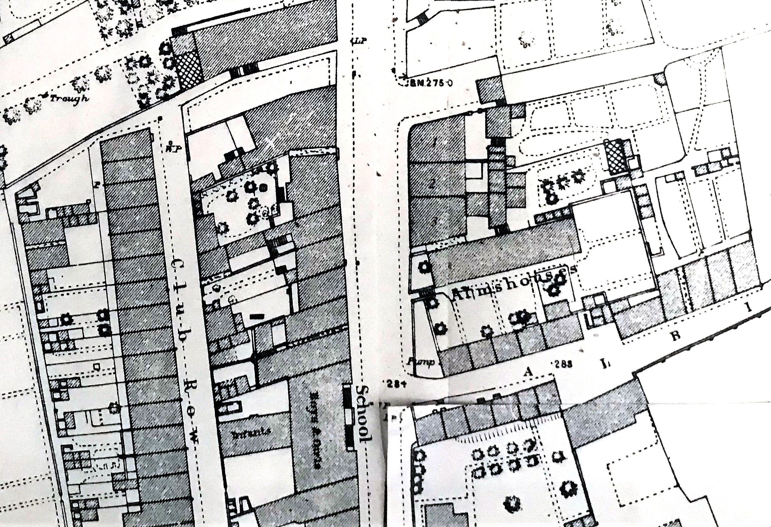 Adeline now leads us past the row of three shops (numbered in the map below) before pointing out that “below Jack Lee’s yard and up some steps were the old Smedley’s Alms Houses”. We can see them adjacent to Albion Place and almost opposite the British School.