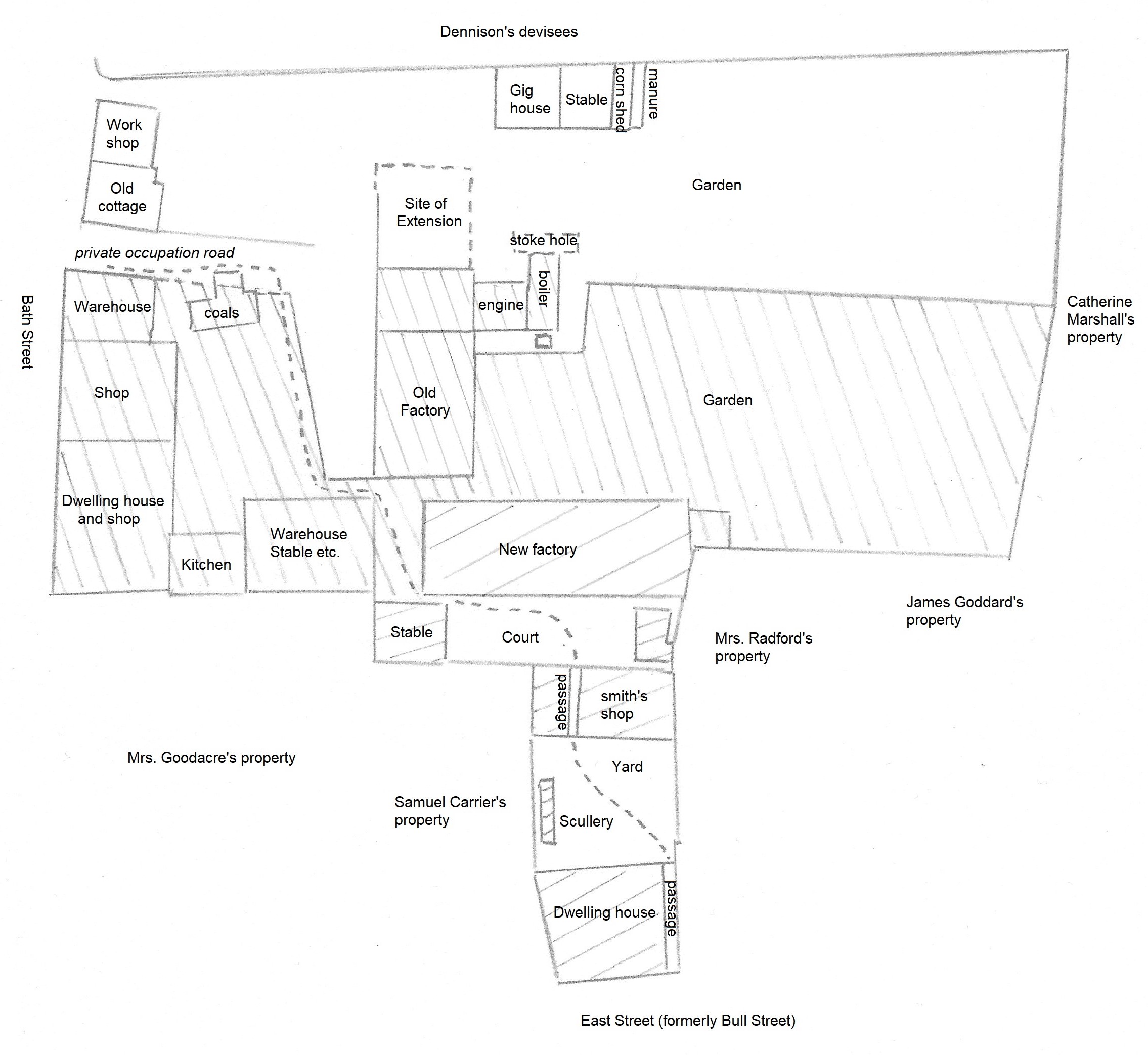 On October 10th 1859 it was decided among the family that all this property would be divided between his three brothers and his nephew Henry Macdonald, the son of his deceased sister Ann. William’s estate comprised his share of the three messuages in East Street (remember those ? — previously rented by John Eminson, Thomas Scattergood, and Anchor Carrier, then by Henry Carrier, Joseph Knighton and Widow Blount, then by James Brentnall, John Woodroffe and Mary Askew — and now occupied by Thomas Harrison, James Scattergood and Henry Eminson); the two workshops at the bottom of that area; a factory and yard on the adjoining land, now rented by his brothers Samuel and Henry Carrier, and his nephew Henry Macdonald. These can be seen on Plan 4 (above), at East Street. There was also land and four dwellings in South Street (Pleasant Place). All of this was to be now in the possession of Henry and Samuel Carrier, and nephew Henry Macdonald. At the same time brother Joseph Carrier took possession of the remainder of the late William’s South Street holding which was north of Pleasant Place and just south of the strip recently sold to William Gregory. He also gained the Extension Street land plus the six dwellings there which William had erected, (then occupied by William Beniston, John Blake, Joseph Bryan. Francis Crooks, Norman Straw and Isaac Martin). This area was what was known then as the ‘South end of the Hayes’.