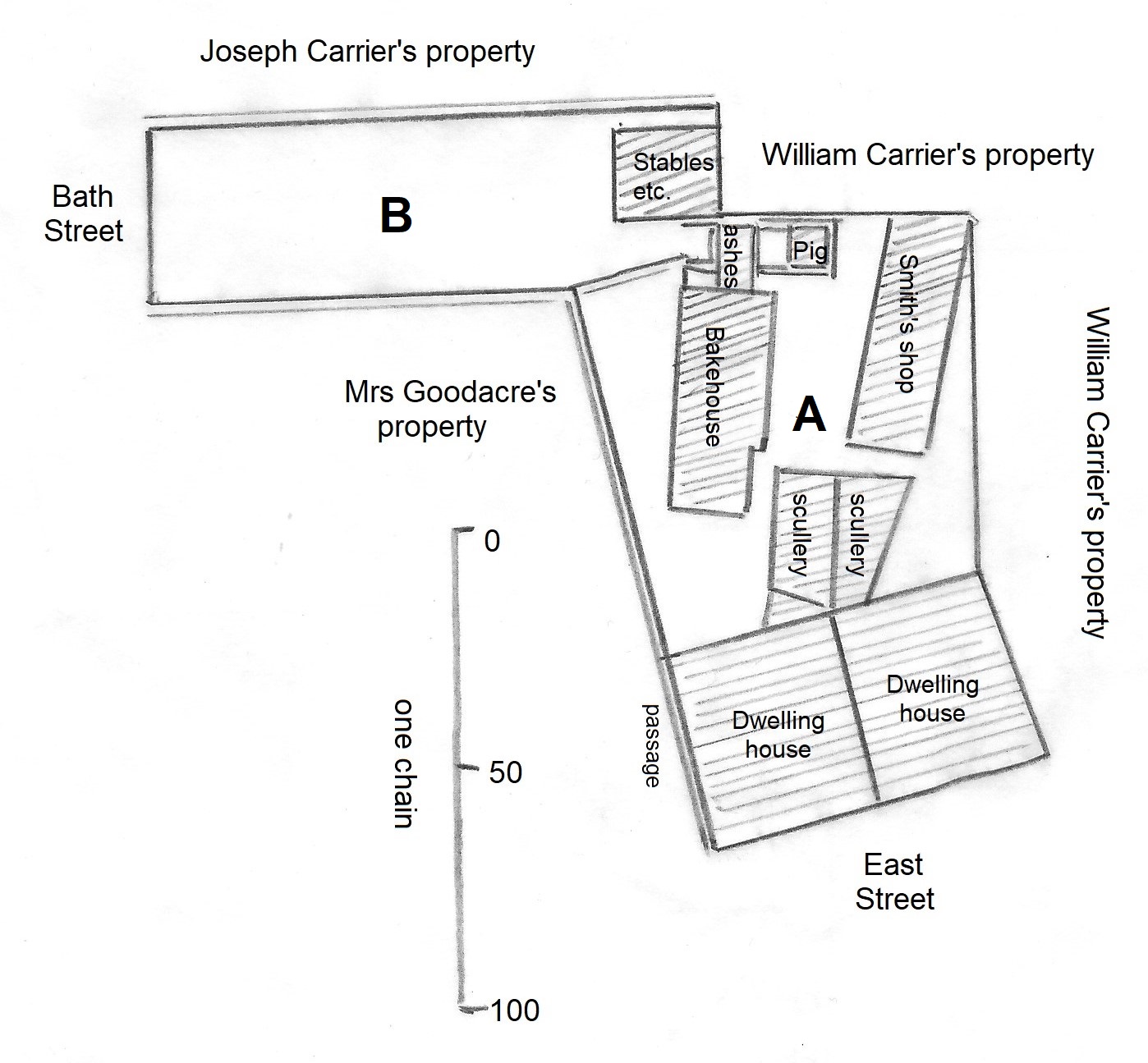 At the same time the area shown in the plan below and held jointly by Samuel and Joseph Carrier was divided between the two brothers — William was assigned area A and Joseph got B. And it was at this time that the ‘Mansion House’ in East Street was divided into ‘three tenements’ — two houses and the County Court building ?